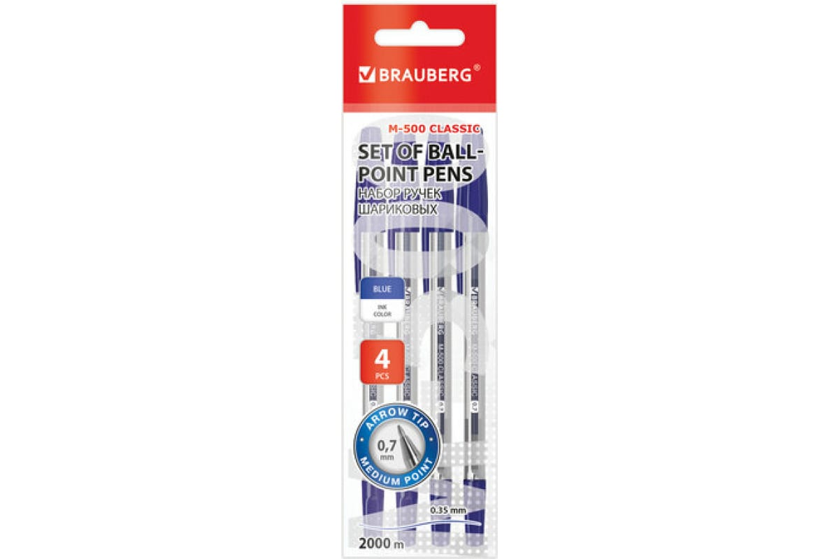 Шариковые ручки BRAUBERG M-500, НАБОР 4 шт, синие, узел 0.7мм, линия письма 0.35 мм 143453