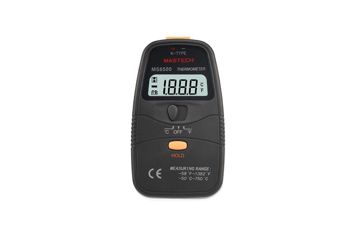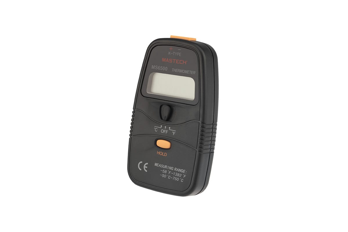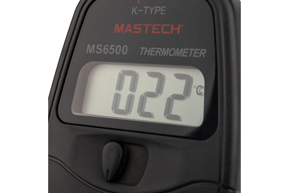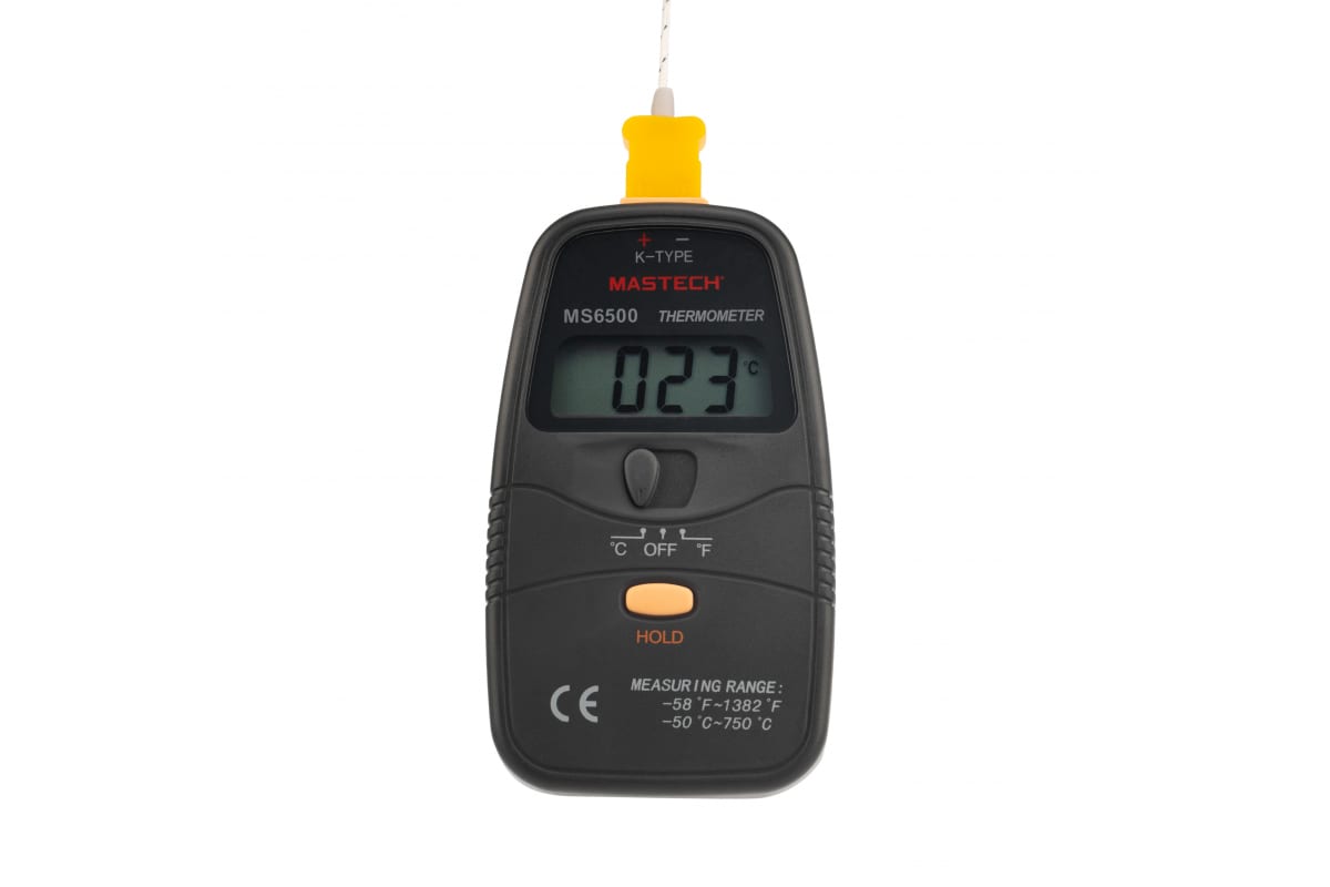Цифровой термометр MASTECH MS6500 13-1240 используется для измерения температуры окружающей среды или предметов. Оснащен термопарой типа К, подсоединяемой через разъем в верхней части корпуса.