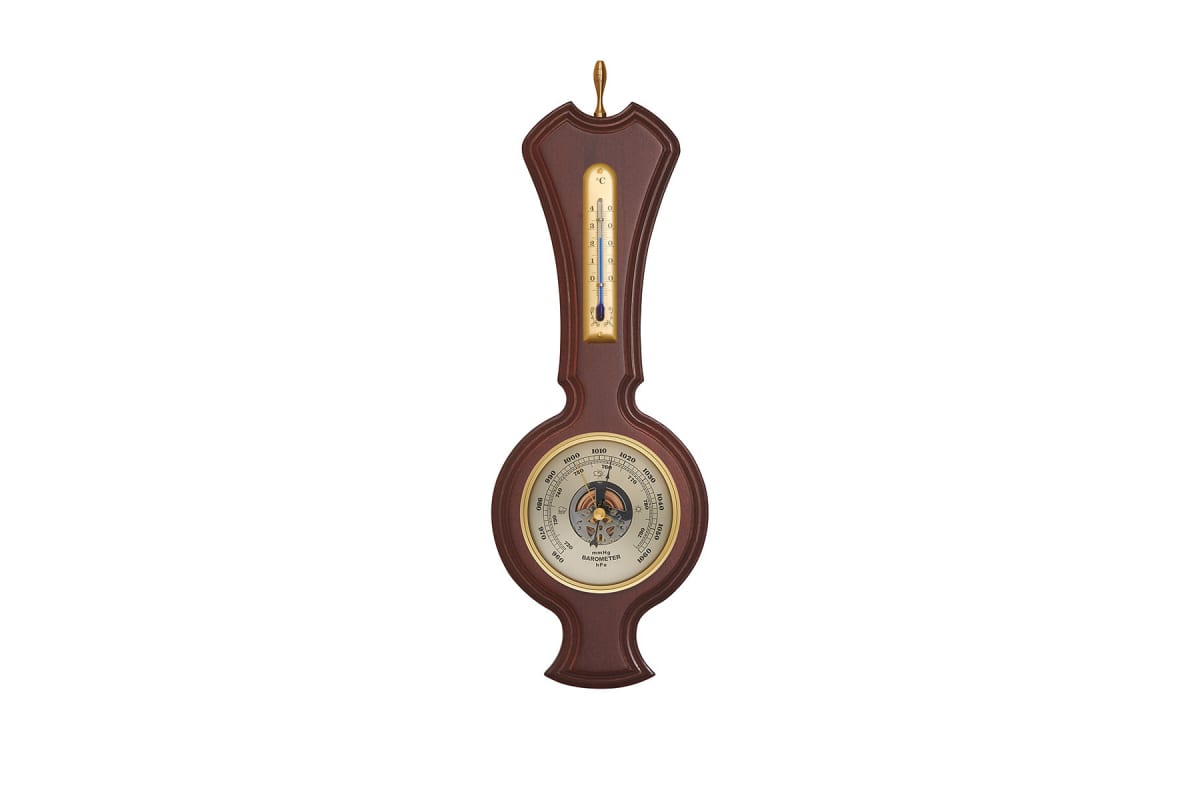 Размеры корпуса (сложная фигурная форма, бук, цвет - махагон) 332х114 мм, размеры барометра ф90мм, шкала термометра 95х18мм.