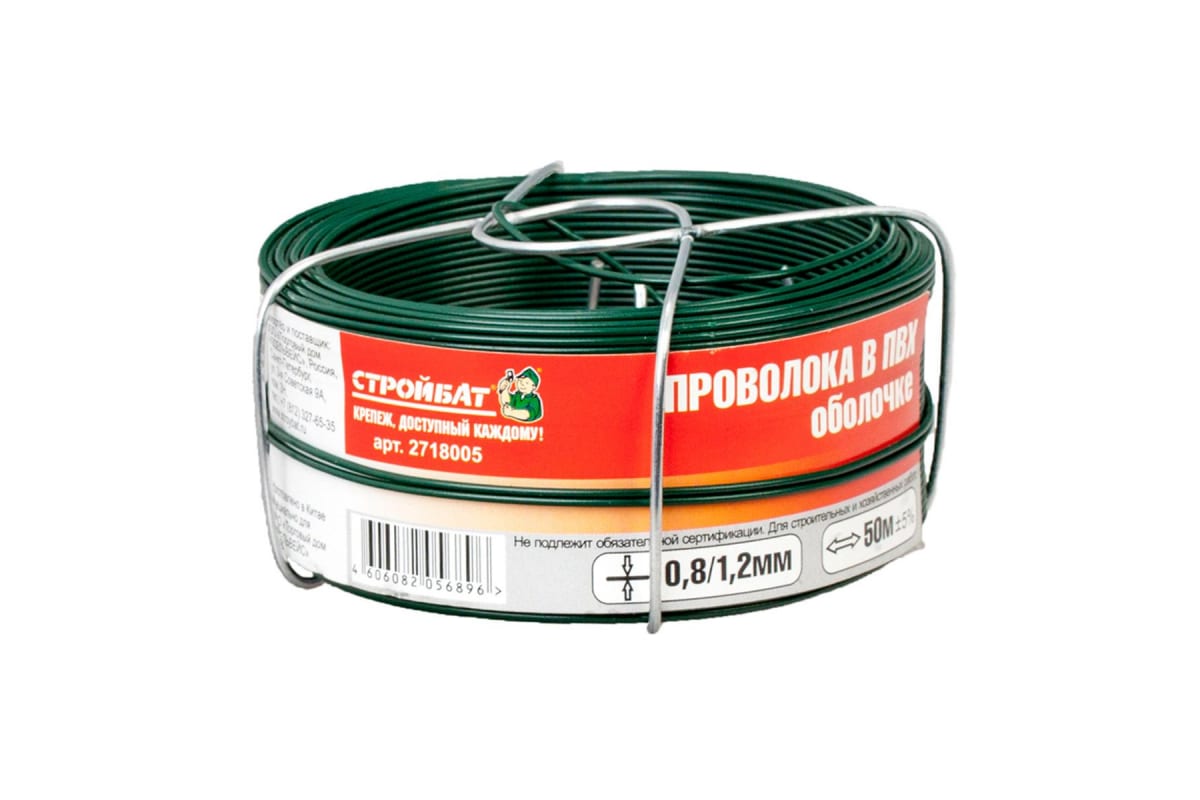 Проволока в ПВХ оболочке Стройбат 0.8/1.2 мм, 50 м 2718005 пригодится в сельском хозяйстве и быту для натяжения шпалер, а также lkz изготовления сетки Рабица.