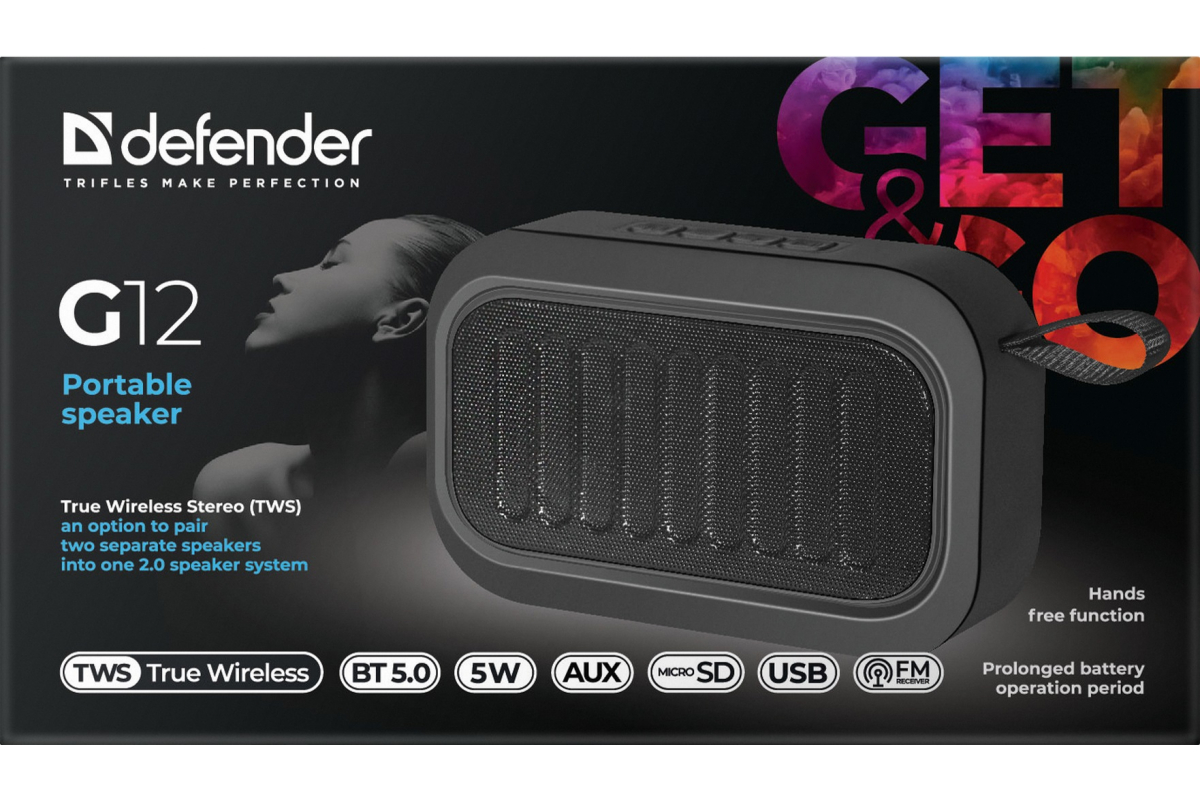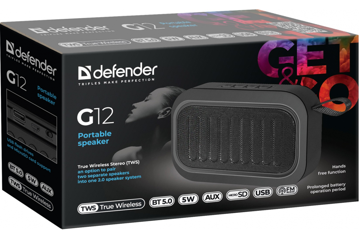 Портативная акустика DEFENDER G12, 5Вт, BT/FM/TF/USB/AUX/TWS, 65012