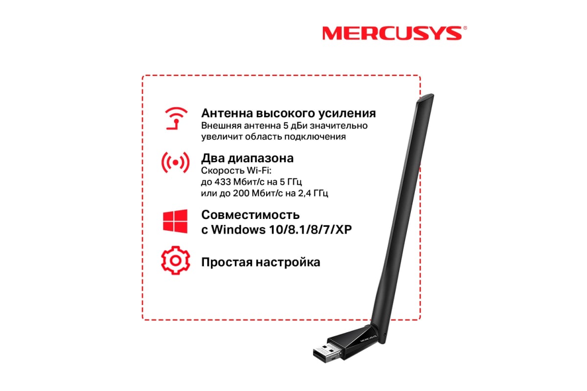 Дополнительные характеристики сетевого адаптера MERCUSYS WiFi AC650 USB 2.0 антенна внешняя несъемная 1ант. MU6H: