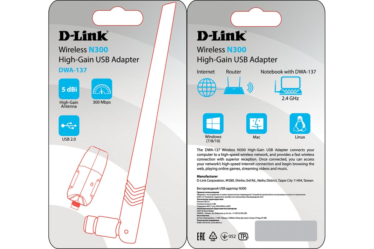 Беспроводной USB-адаптер d-link DWA-137/C1A N300 DWA-137/C1A обеспечивает Wi-Fi-подключение с улучшенным качеством приема сигнала для комфортного просмотра Web-страниц, потокового видео, доступа к играм в режиме онлайн без задержек, а также совместного доступа к различному контенту. Адаптер DWA-137 предоставляет возможность использования беспроводного подключения в труднодоступных местах.