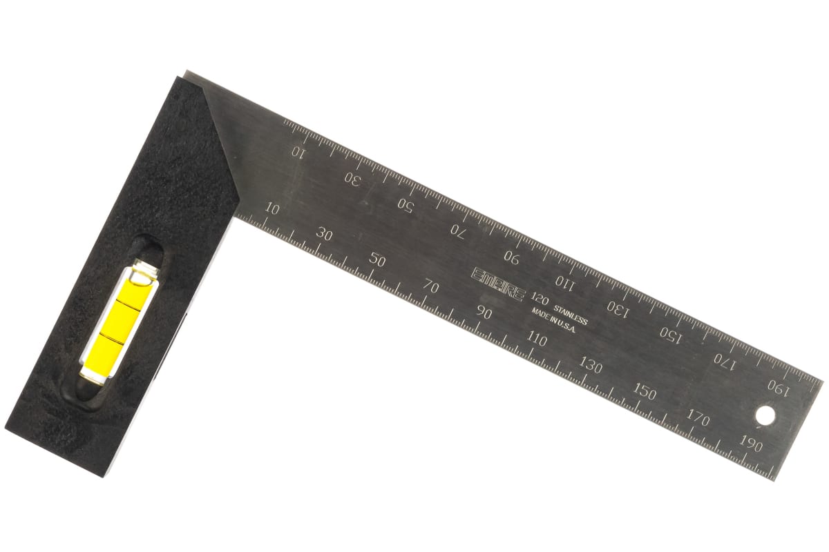 Угольник 200мм Empire 120M 5132002905 можно использовать для определения углов 90 и 45 градусов. Толстая рукоять повышает удобство хвата.