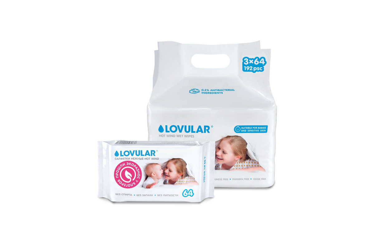 Влажные салфетки LOVULAR СПАЙКА 3*64 шт 429030 подходят как для малышей, так и для всей семьи. Изготовлены из специального безворсового материала особого плетения. Новая технология HOT WIND использует обработку горячим паром. Это обеспечивает состояние продукта близкое к стерильному. Пропитка салфеток содержит 99.8% чистейшей воды, а так же натуральные компоненты.
