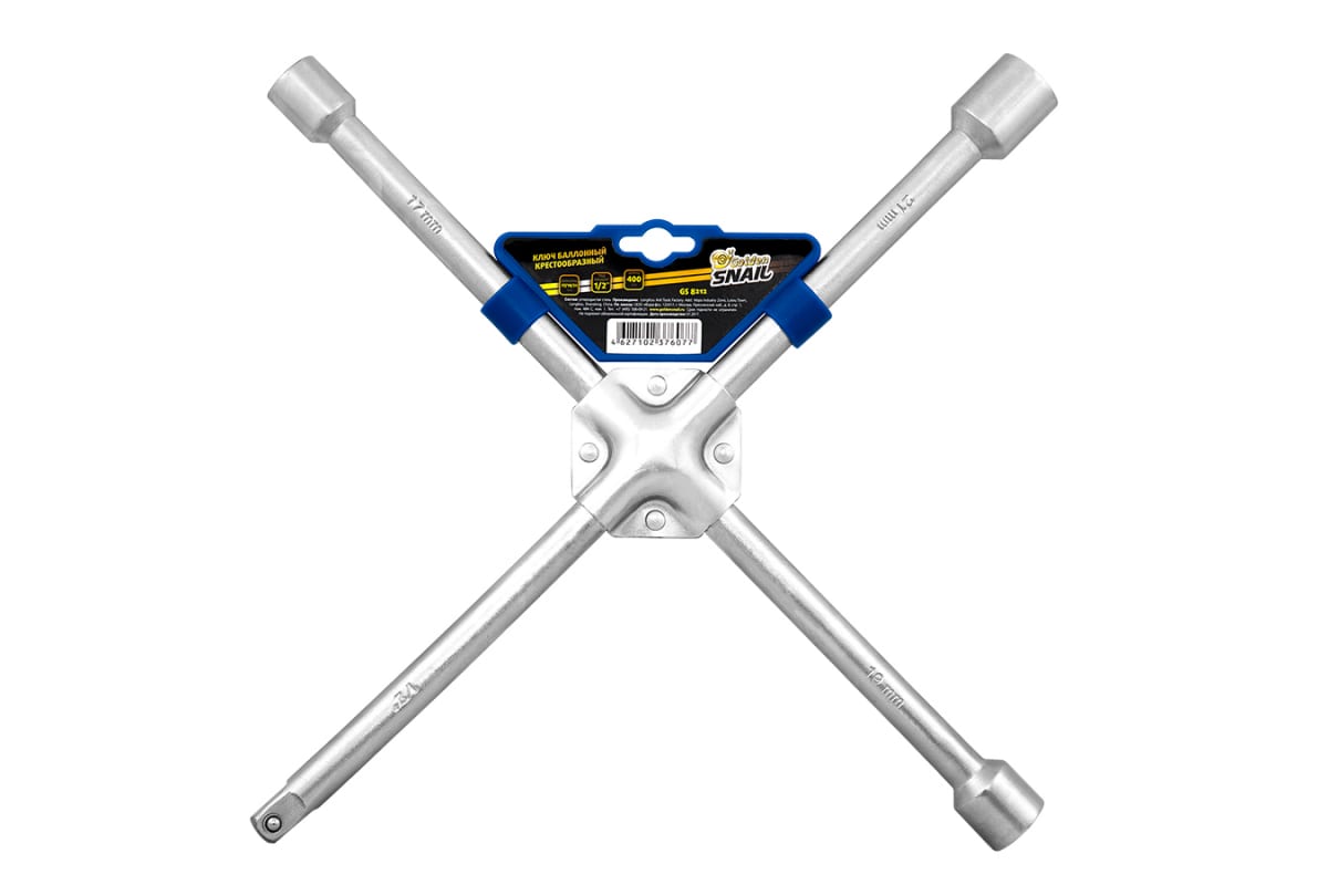 Баллонный ключ Golden Snail крест, 17x19x21x22х1/2", усиленный, хром GS8212 применяется для снятия и установки колесных крепежных элементов легковых автомобилей. Размер: 17,19,21 мм. Посадочный квадрат 1/2 дюйма.