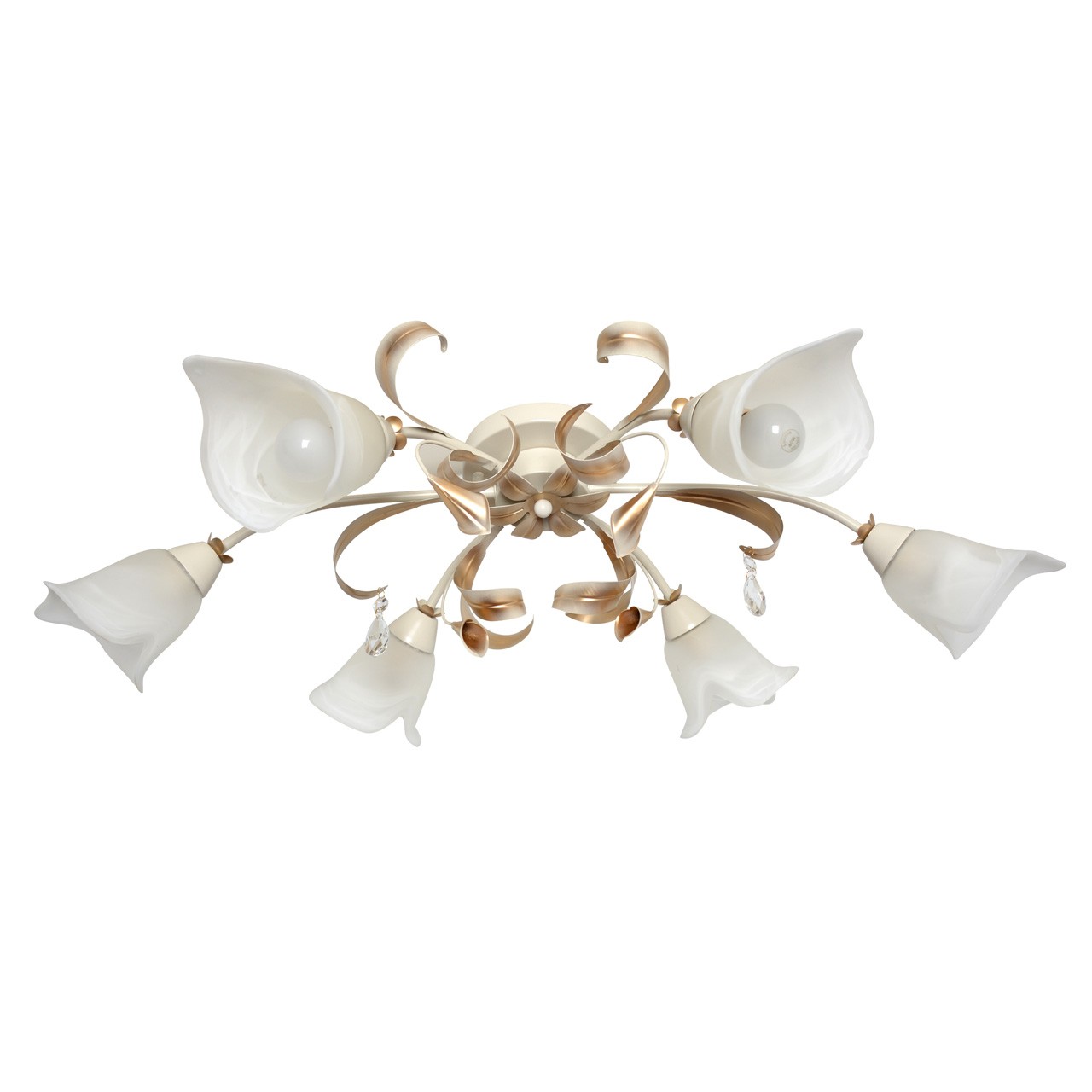 Преимущества моделиКомпактная высота актуальна для стандартной высоты потолка. Широкий диаметр обеспечивает высокие параметры освещения. Флористический дизайн в трендовых оттенках белого с градиентом золотого. Плафоны алебастрового стекла обеспечивают мягкий комфортный свет. Декор ручной работы растительных элементов дополнен подвесками акрила..