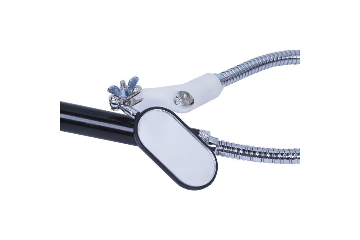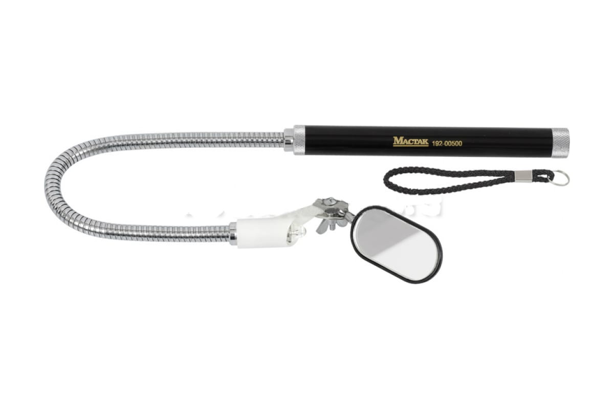 Зеркало на гибком стержне 500мм МАСТАК 192-00500 с подсветкой служит для осмотра и диагностики поломок в труднодоступных местах у различных узлов и агрегатов, например, при ремонте автомобилей. Для удобства переноски изделия на кончике рукоятки предусмотрена наручная петля. Устройство работает от батареек 2хАА (приобретаются отдельно). Вес - 0.226 кг.