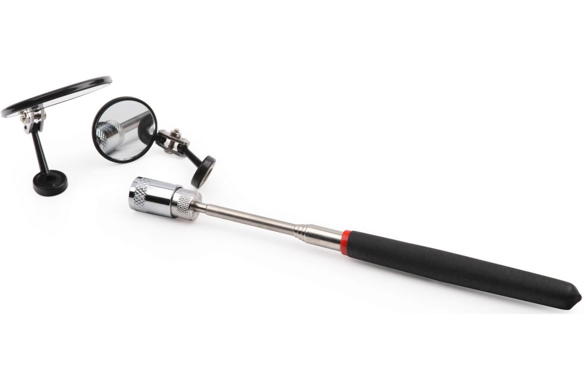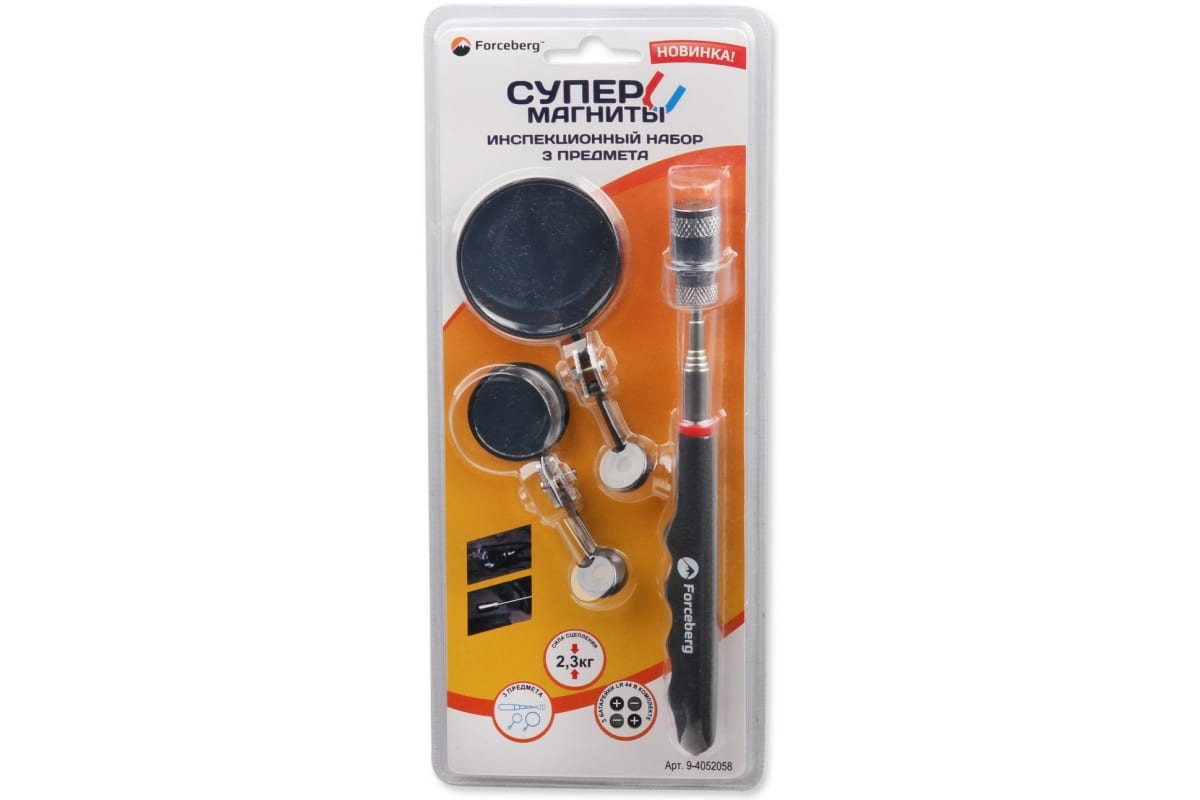 Инспекционный набор 3шт Forceberg 9-4052058 состоит из двух зеркальных насадок и усиленного телескопического магнита с силой сцепления до 2.3 кг. Рукоятка имеет возможность выдвижения на длину до 80 см. Магнит дополнительно оснащен светодиодным фонариком. Изделие позволяет удержать и извлечь упавшую делать или крепеж из самых труднодоступных мест. Зеркальные насадки используются для осмотра различных механизмов с разных ракурсов. Представленный комплект станет надежным помощником в бытовых условиях, в автосервисных и столярно-слесарных мастерских.