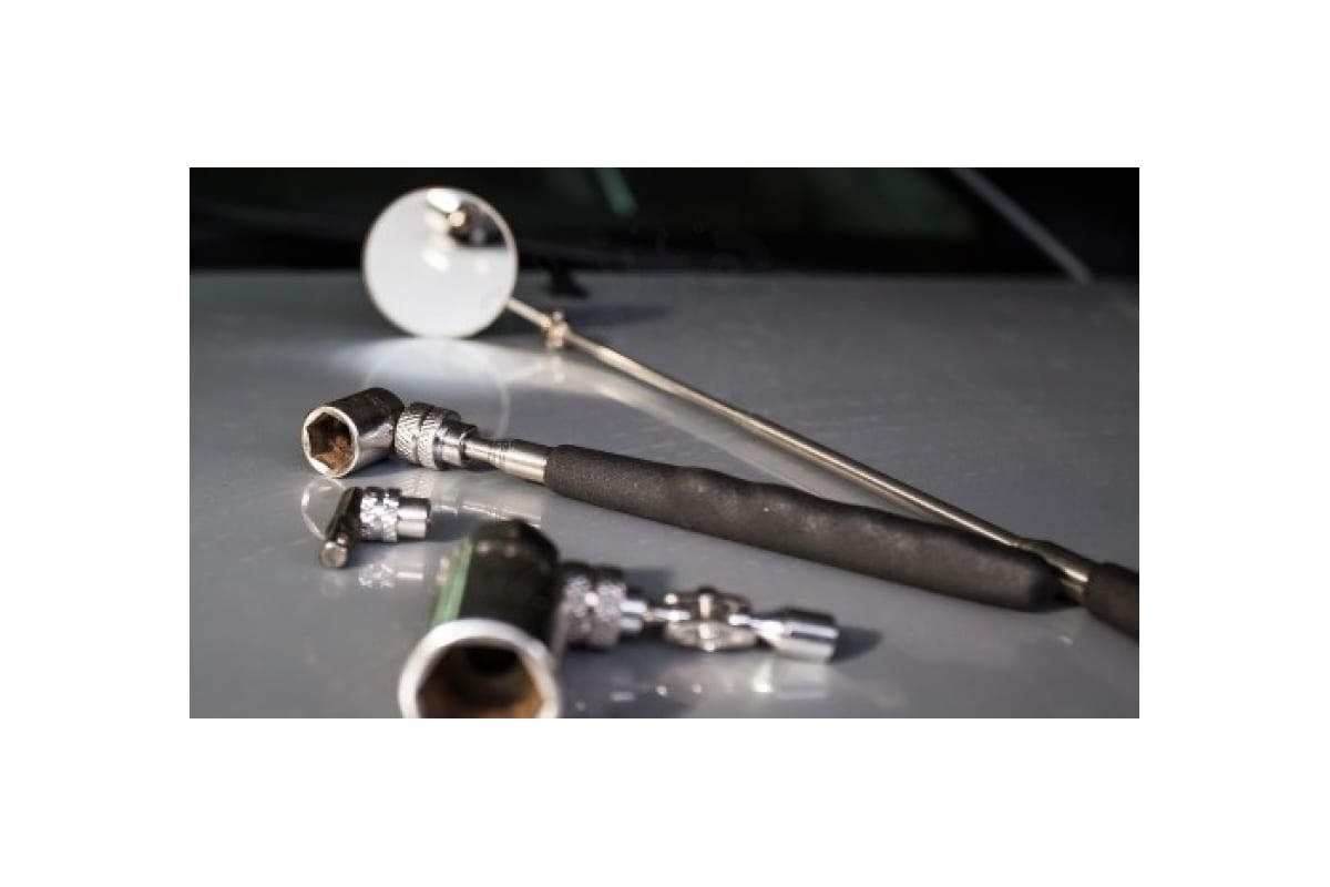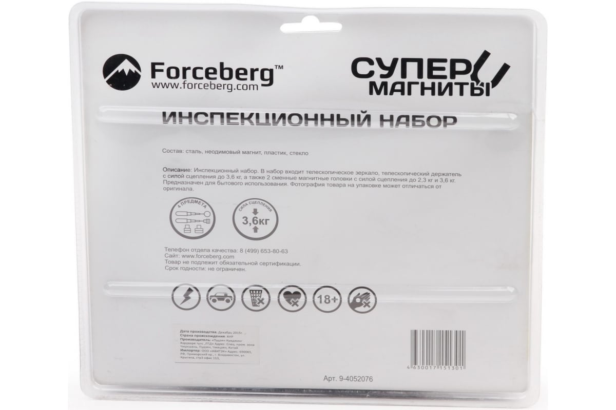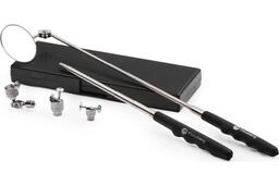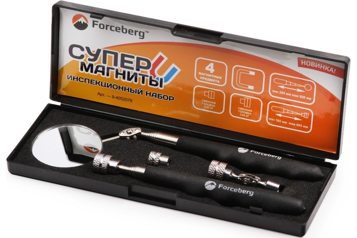 Инспекционный набор с дополнительными насадками Forceberg 9-4052076 актуален для использования в автосервисах, различных мастерских, производственных цехах и пр. Приспособления, входящие в данный набор, позволят заглянуть в самые труднодоступные места узлов и агрегатов, отыскать упавшие, закатившиеся детали и крепеж. Телескопическое зеркало способно выдвигаться на длину от 204 до 920 мм. Магнитный держатель имеет силу сцепления 3.6 кг, ручка также раскладывается на длину 165-605 мм. Две сменные магнитные головки позволяют удерживать элементы массой до 2.3 кг и 3.6 кг.