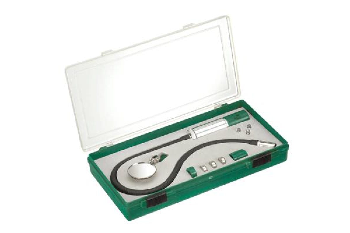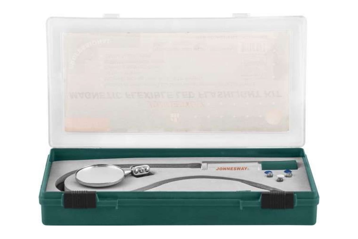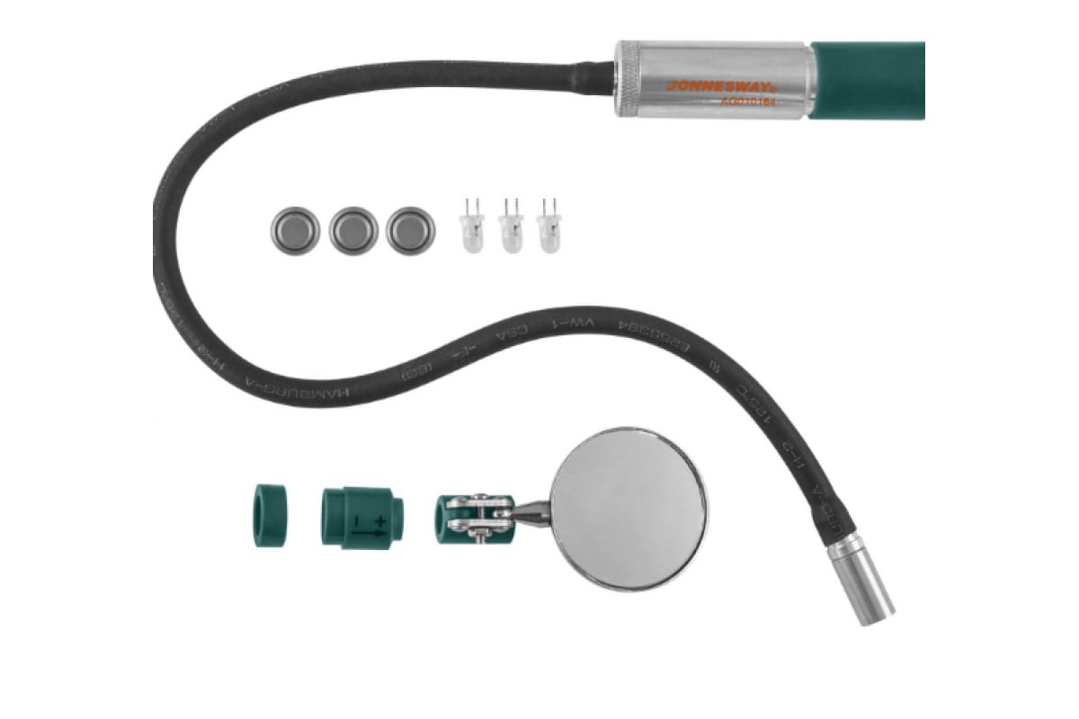 Инспекционный набор Jonnesway AG010164 состоит из гибкого магнитного фонарика с инновационными сменными светодиодными лампами, которые включают различный свет: УФ, синий или белый, а также съемного зеркала Ø 38 мм. Набор оснащен специальным закрывающимся футляром, который делает его мобильным. Комплект инструментов активно применяется при ремонте автомобилей и различного оборудования.
