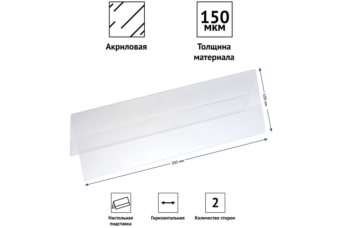 Подставка для презентаций OfficeSpace 300х100 мм, двусторонняя, горизонтальная Pdp_28686 можно использовать с двух сторон. Она изготовлена из прозрачного прочного акрила толщиной 150 мм. Подходит для размещения именной информации или презентационных материалов. Перед использованием необходимо снять защитную пленку. Поставляется подставка в собранном виде.