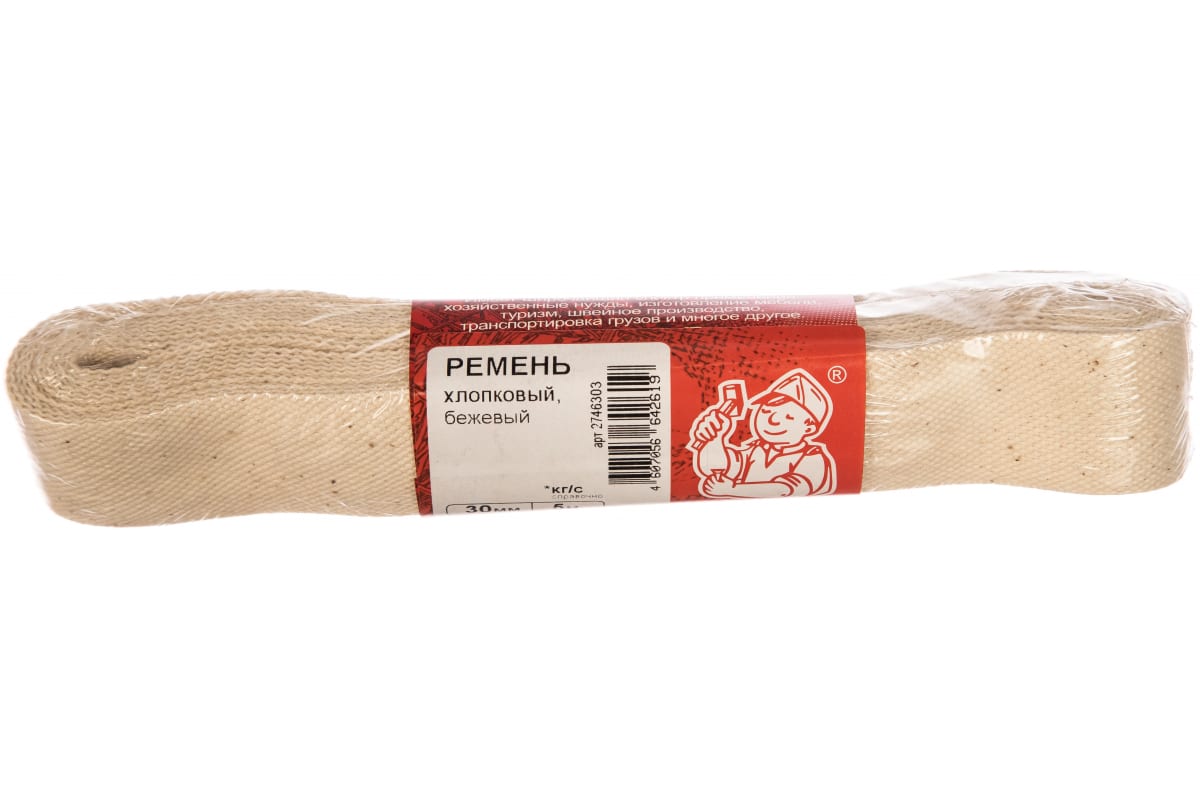 Хлопковый ремень (бежев., 30 мм, 5 м) Стройбат 332810 применяется для фиксации и транспортировки грузов. Ремень устойчив к истиранию и химическим воздействиям. Изделие обладает высокой прочностью и устойчивостью к износу.