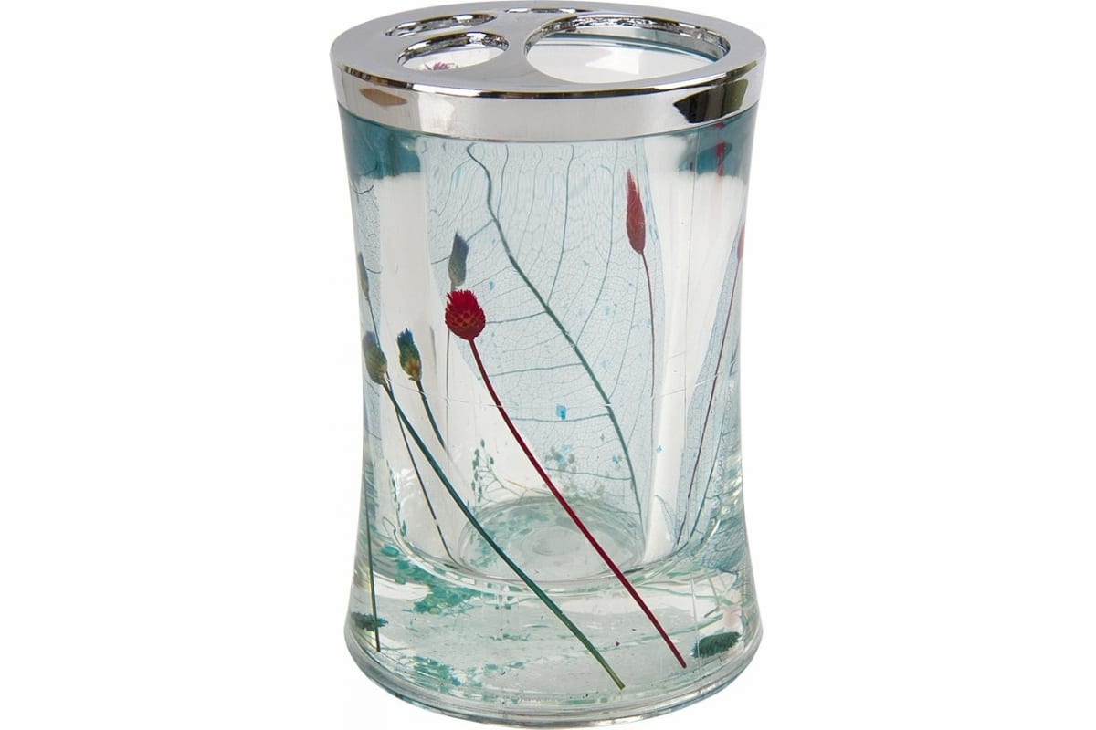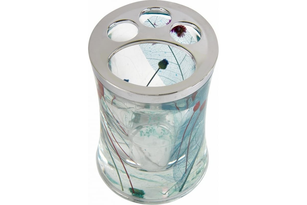 Стакан выполнен из полимерного материала с декоративным гелевым наполнением, он устойчив к опрокидыванию и не боится влаги. Предназначен для хранения в нем щеток, тюбиков зубной пасты и прочих мелочей.