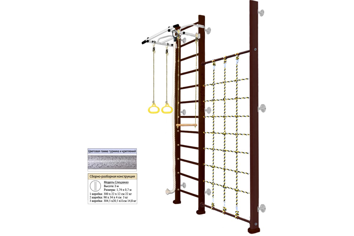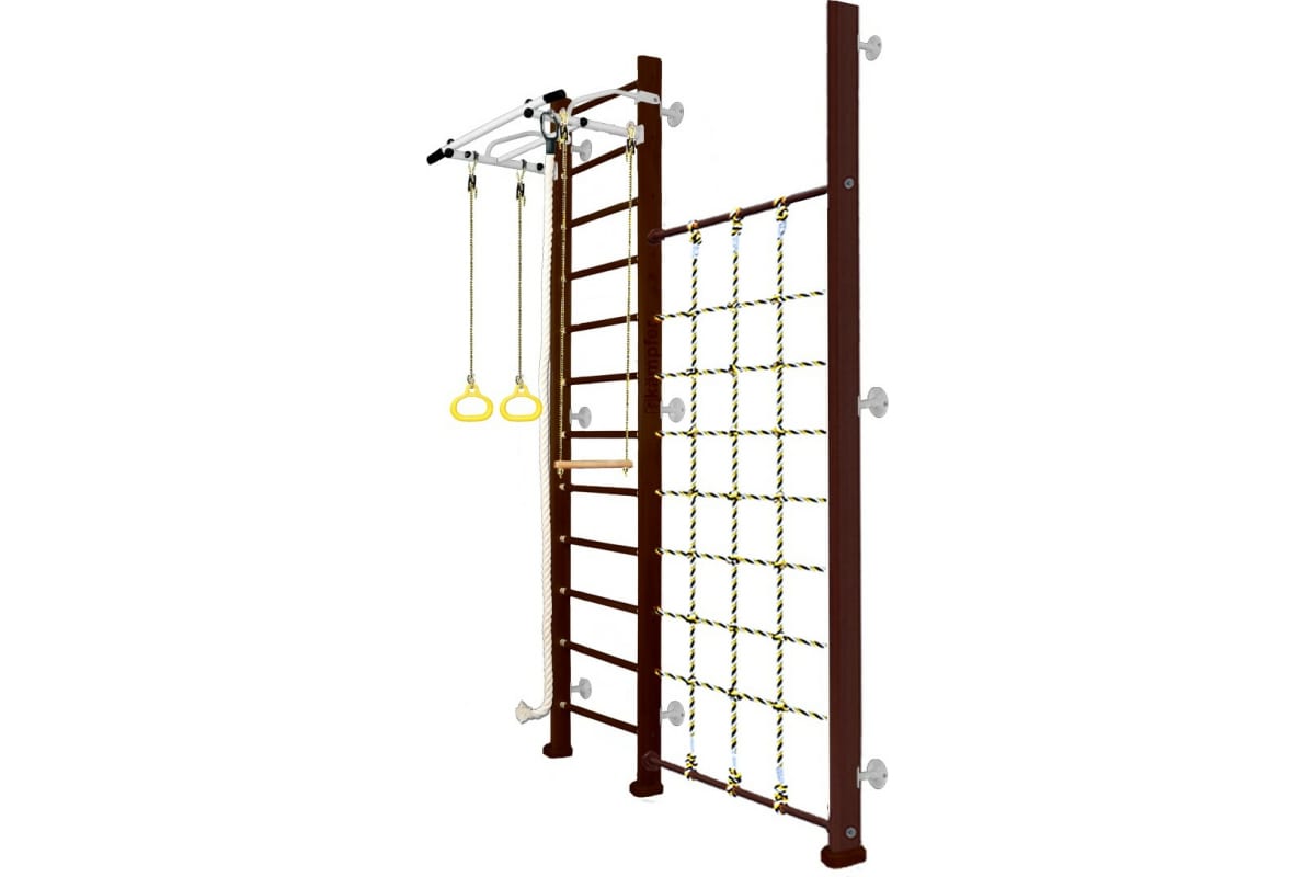 Шведская стенка Kampfer Winner Wall, №5 шоколадный, высота 3м, антик, турник K03991021 – домашний спортивный комплекс, который включает в себя шведскую стенку, металлический турник, канат, кольца, трапецию и канатный лаз.