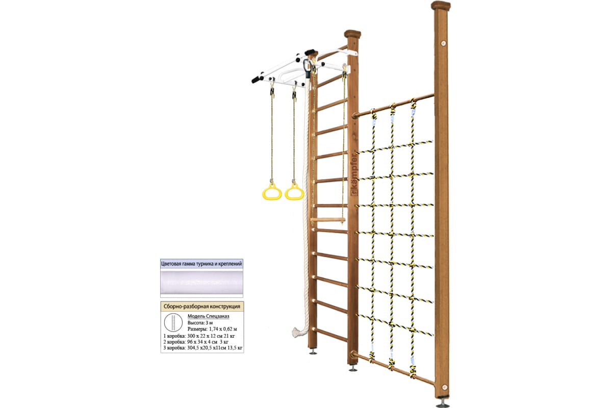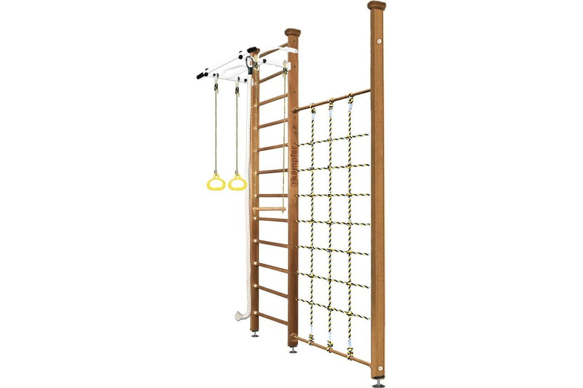 Шведская стенка Kampfer Winner Ceiling, №2 ореховый, высота 3м, белый, турник K03993010 – домашний спортивный комплекс, который включает в себя шведскую стенку, металлический турник, канат, кольца, трапецию и канатный лаз.