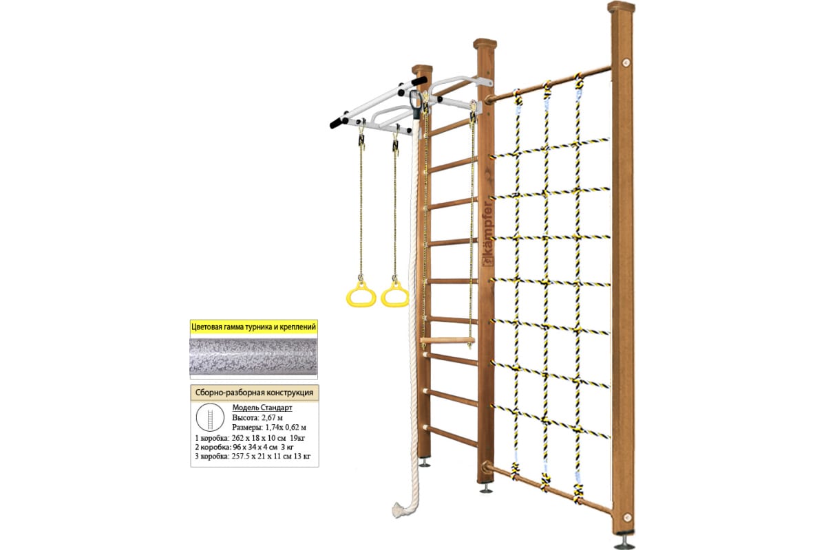 Шведская стенка Kampfer Winner Ceiling, №2 ореховый, стандарт, антик, турник K03993011 – домашний спортивный комплекс, который включает в себя шведскую стенку, металлический турник, канат, кольца, трапецию и канатный лаз.