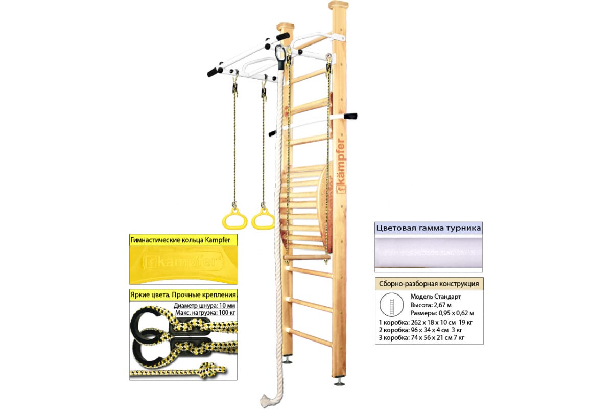 Шведская стенка Kampfer Helena Maxi Ceiling №1, натуральный, стандарт, белый, турник K01405008 – детский спортивный комплекс, который включает в себя шведскую стенку, турник, канат, кольца, трапецию и тренажер для спины Kampfer Posture Wall.