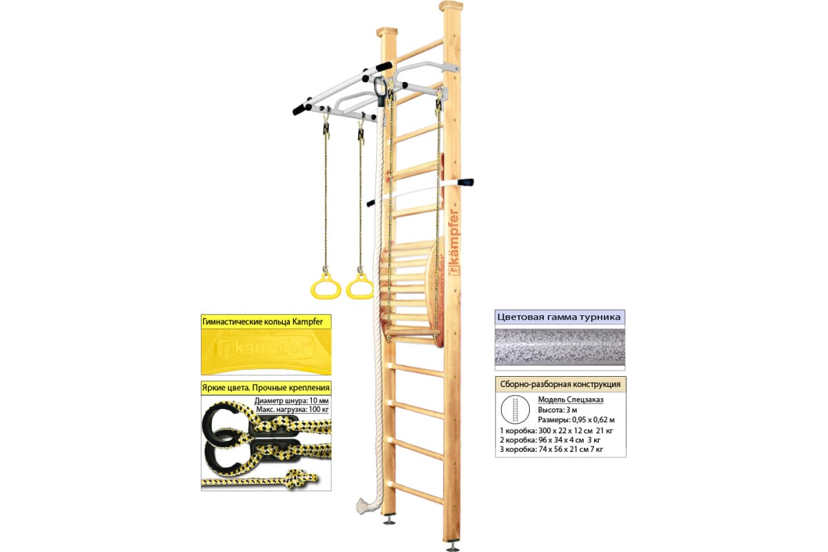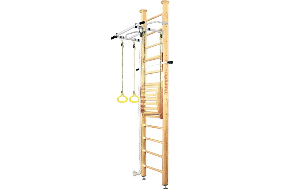 Шведская стенка Kampfer Helena Maxi Ceiling №1, натуральный, высота 3м, антик, турник K01405005 – детский спортивный комплекс, который включает в себя шведскую стенку, турник, канат, кольца, трапецию и тренажер для спины Kampfer Posture Wall.