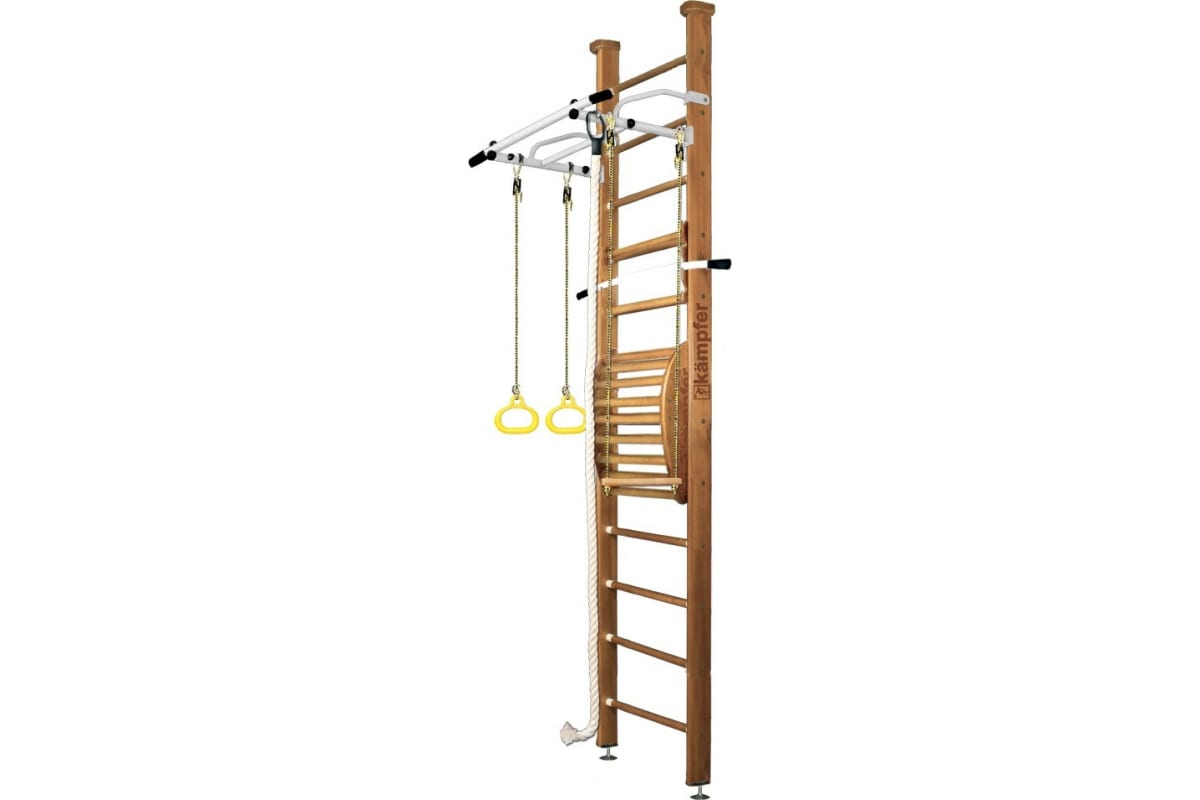 Шведская стенка Kampfer Helena Maxi Ceiling №2, ореховый, высота 3м, антик, турник K01405009 – детский спортивный комплекс, который включает в себя шведскую стенку, турник, канат, кольца, трапецию и тренажер для спины Kampfer Posture Wall.