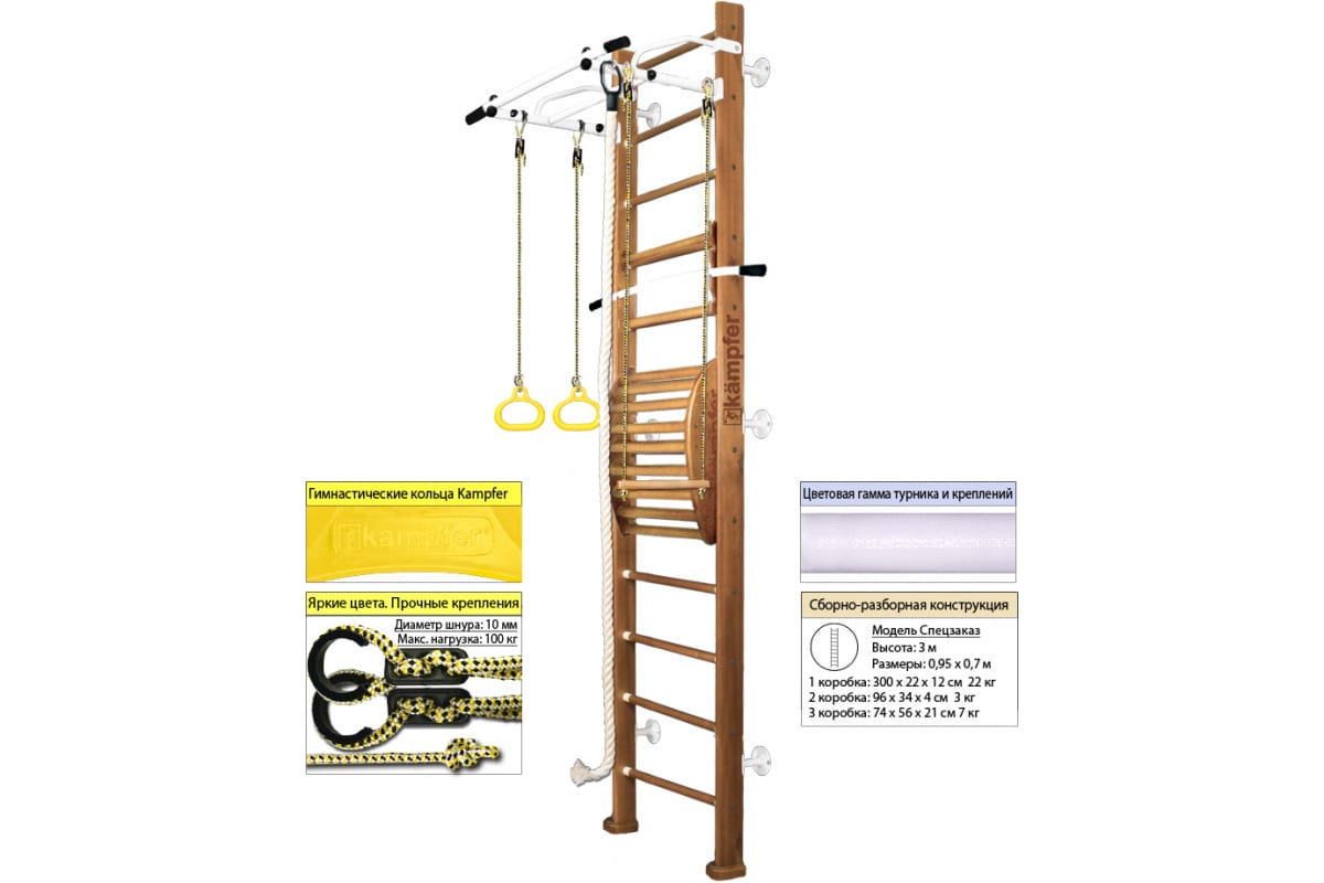 Шведская стенка Kampfer Helena Maxi Wall, №2 ореховый, высота 3м, белый, турник K03622010 – детский спортивный комплекс, который включает в себя шведскую стенку, турник, канат, кольца, трапецию и тренажер для спины Kampfer Posture Wall.