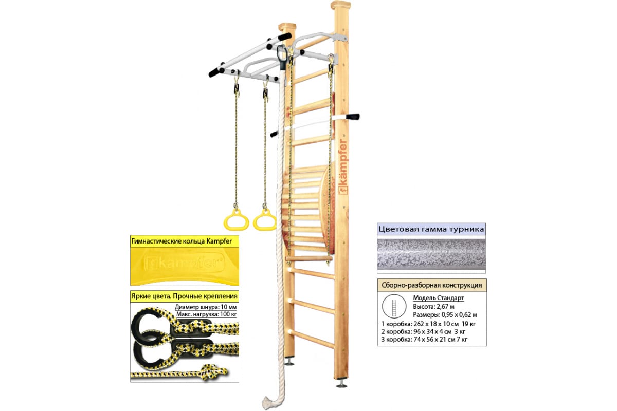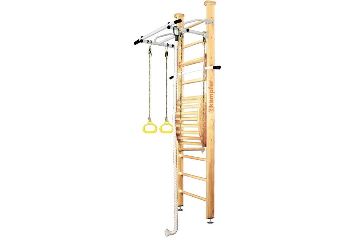 Шведская стенка Kampfer Helena Maxi Ceiling №1, натуральный, стандарт, антик, турник K01405007 – детский спортивный комплекс, который включает в себя шведскую стенку, турник, канат, кольца, трапецию и тренажер для спины Kampfer Posture Wall.