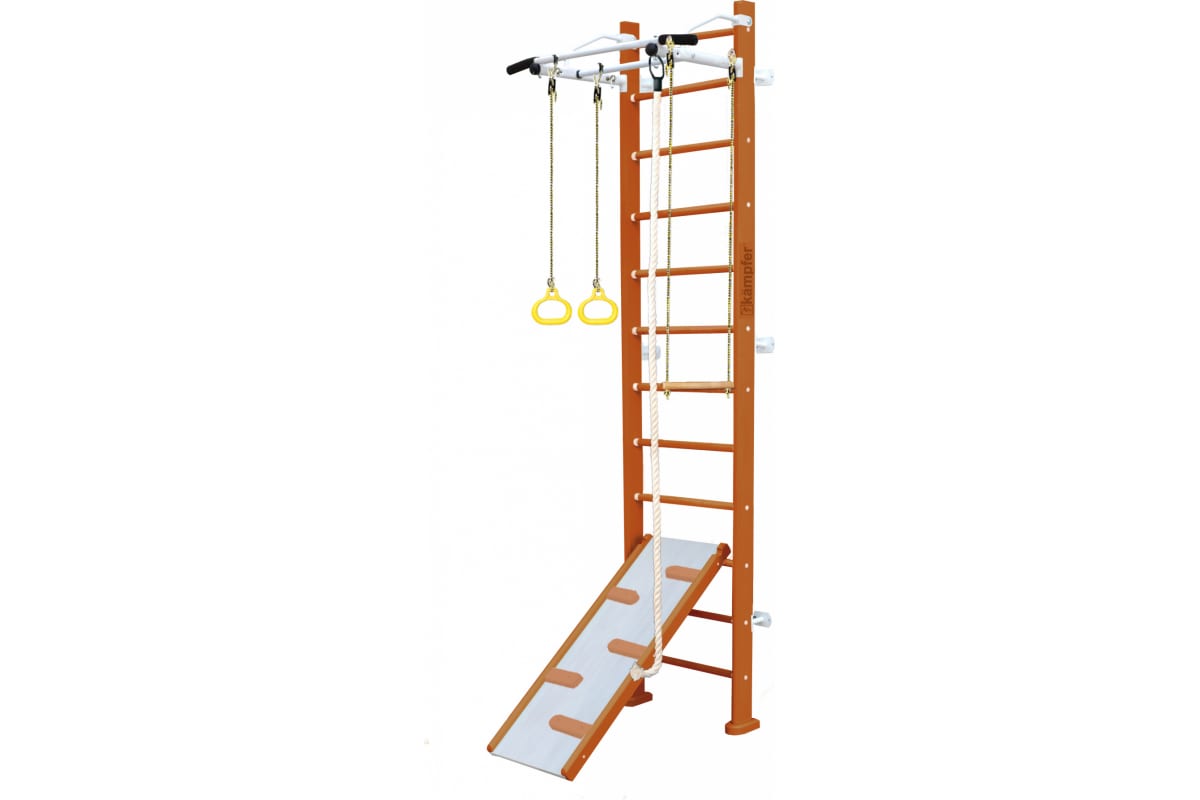 Шведская стенка Kampfer Ride Wall, №3 классический, высота 3м, белый, турник K06811014 – домашний спортивный комплекс, который включает в себя классическую шведскую стенку и металлический турник, а также набор из самых популярных навесных аксессуаров: канат, кольца, трапеция и двухсторонний скат-скалолаз.