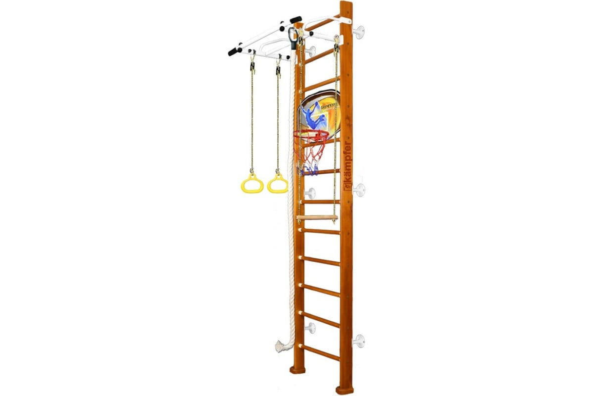 Шведская стенка Kampfer Helena Wall Basketball Shield, №3 классический, высота 3м, антик, турник K06535013 – детский спортивный комплекс, который включает в себя шведскую стенку, турник, канат, кольца, трапецию и баскетбольный щит с мячом.
