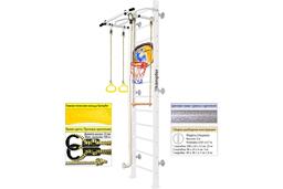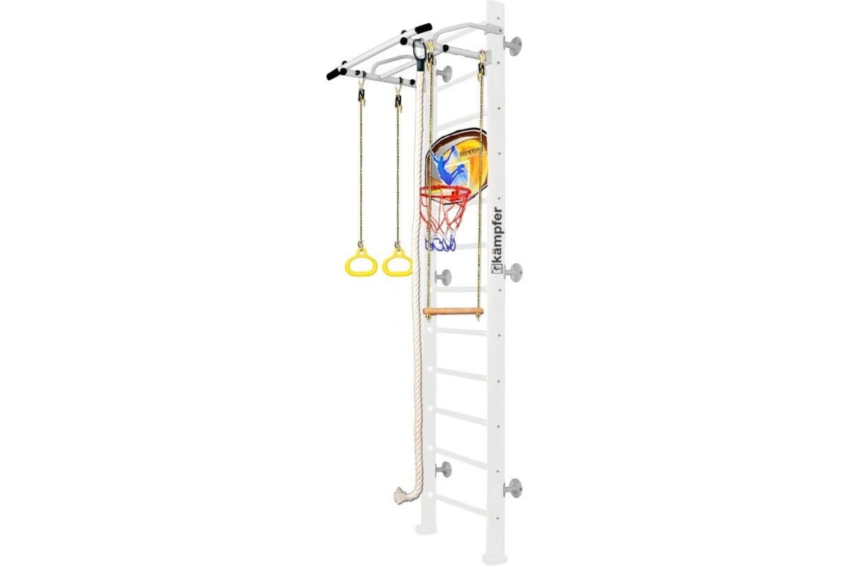 Шведская стенка Kampfer Helena Wall Basketball Shield, №6 жемчужный, высота 3м, антик, турник K06535025 – детский спортивный комплекс, который включает в себя шведскую стенку, турник, канат, кольца, трапецию и баскетбольный щит с мячом.
