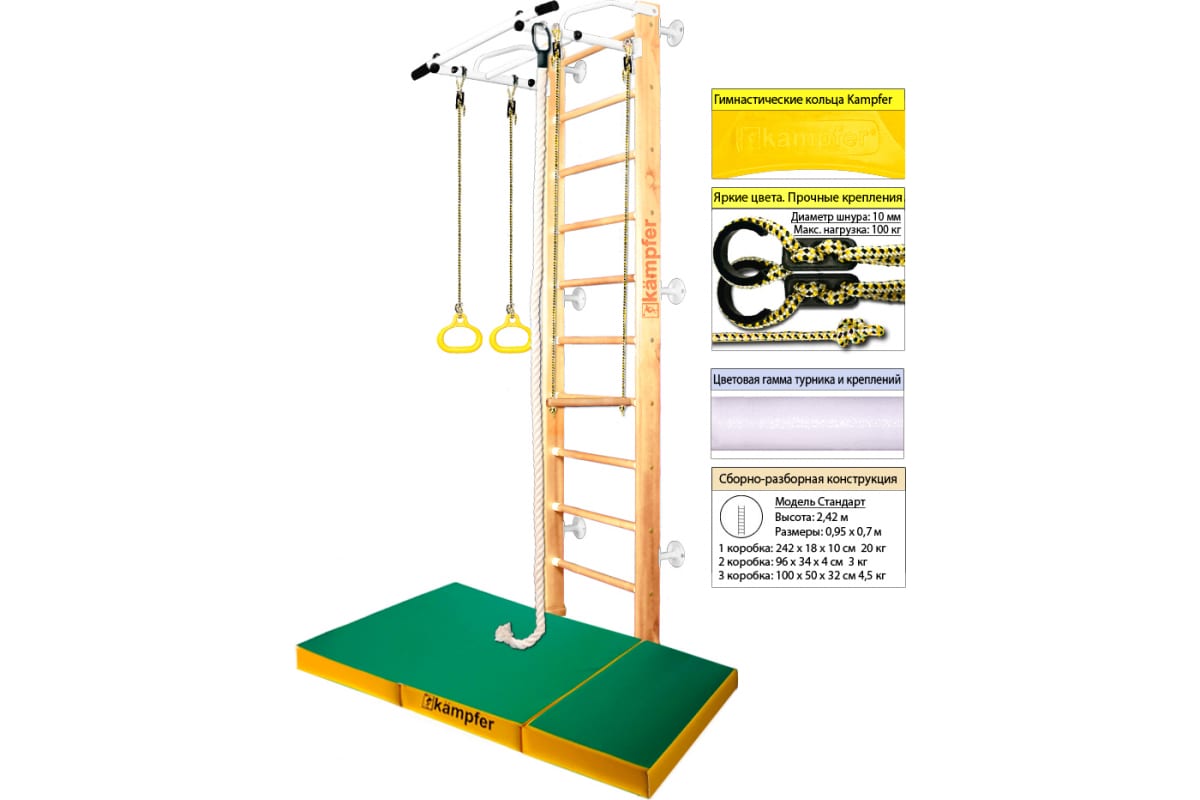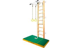 Шведская стенка с матом Kampfer Helena Wall, №1 натуральный, стандарт, турник, мат №6 зеленый K09981001 – детский спортивный комплекс, который включает в себя популярные навесные аксессуары (канат, гимнастические кольца, трапецию), а также складной мат №6 (150х100х10 см).