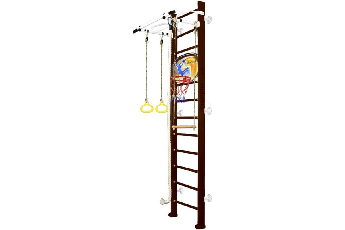 Шведская стенка Kampfer Helena Wall Basketball Shield, №5 шоколадный, высота 3м, белый, турник K06535022 – детский спортивный комплекс, который включает в себя шведскую стенку, турник, канат, кольца, трапецию и баскетбольный щит с мячом.