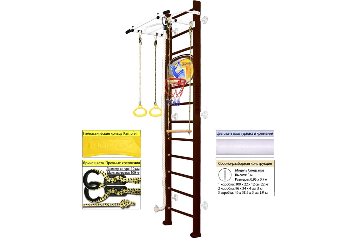 Шведская стенка Kampfer Helena Wall Basketball Shield, №5 шоколадный, высота 3м, белый, турник K06535022