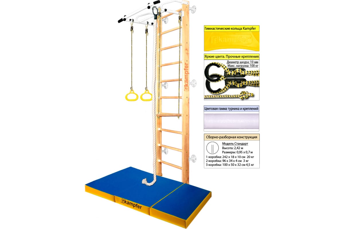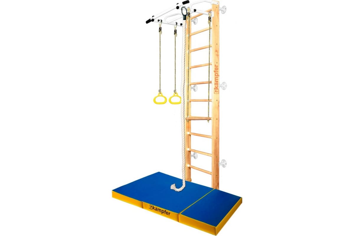 Шведская стенка с матом Kampfer Helena Wall, №1 натуральный, стандарт, турник, мат №6 синий K09981003 – детский спортивный комплекс, который включает в себя популярные навесные аксессуары (канат, гимнастические кольца, трапецию), а также складной мат №6 (150х100х10 см).