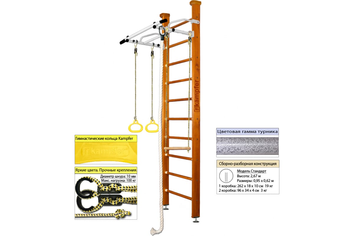 Шведская стенка Kampfer Helena Ceiling №3, классический, стандарт, б. антик, турник K01404015 – детский спортивный комплекс, который включает в себя шведскую стенку, турник, канат, кольца и трапецию.