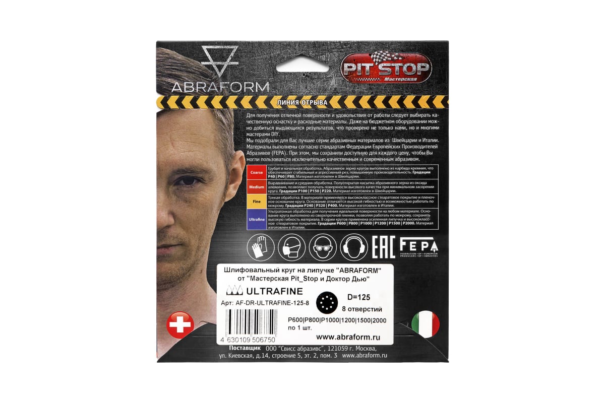 Шлифовальный круг на липучке ABRAFORM от "Мастерская Pit_Stop и Доктор Дью"; Набор ULTRAFINE 125-8: в набор входят профессиональные материалы из Италии, градациями Р600, Р800, Р1000, P1200, P1500, P2000 по 1 кругу на градацию. Абразивное зерно выполнено из оксида алюминия промышленного класса, а сверхпрочное пленочное основание позволяет работать по мокрому и отличается высокой гибкостью. На круг нанесено стеаратовое покрытие для минимального засорения круга, а усиленная липучка позволит надежно фиксировать круг на машинке.
