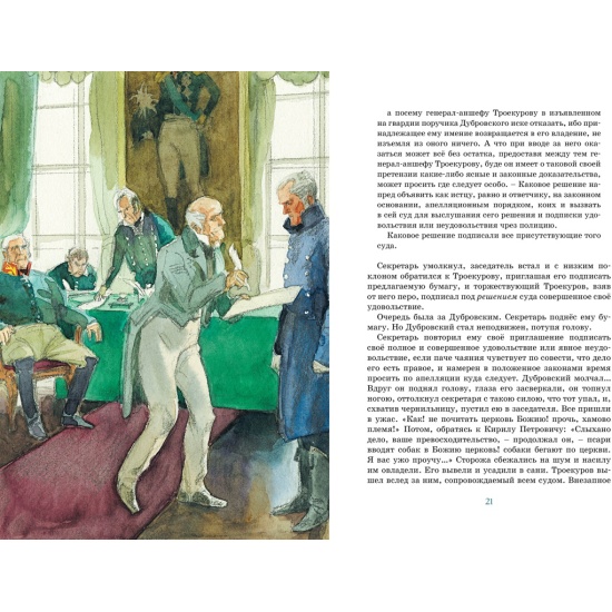 «Дубровский» – маленький шедевр пушкинской прозы. В основе сюжета этого небольшого произведения – романтическая история о благородном разбойнике, обедневшем дворянине Владимире Дубровском. Лишившись родного дома, Дубровский бросает вызов всемогущему барину Троекурову и мстит ему за смерть своего отца и нанесённое оскорбление. Роман при жизни Пушкина остался незаконченным, и название «Дубровский» было дано издателями при его первой публикации в собрании сочинений Пушкина в 1841 году.