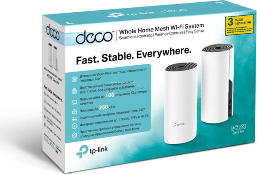 Wi-Fi система TP-LINK Deco M4 (2-pack) – домашняя Mesh Wi-Fi система, состоящая из двух беспроводных маршрутизаторов. Для бесперебойного доступа к Wi-Fi во всем доме Deco M4 использует систему модулей, что позволяет избавьтесь от "мертвых зон". Модули Deco образуют единую домашнюю сеть с одним именем. Клиентские устройства будут автоматически переключаться между разными модулями Deco на высокой скорости, вне зависимости от перемещений устройств. Комплект Deco M4 обеспечивает покрытие до 260 квадратных метров. Для покрытия еще большей площади, в уже существующую Mesh систему можно добавить отдельный модуль. Deco обеспечивает одновременное соединение для более чем 100 устройств. Родительский контроль ограничивает время в сети и блокирует соответствующий контент, создавая уникальные профили для каждого члена семьи. Настройка системы осуществляется в том числе с помощью мобильного приложения Deco.