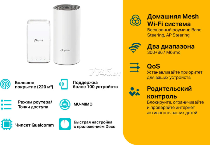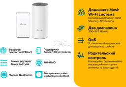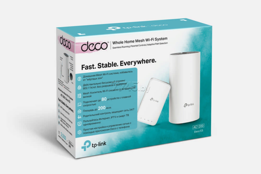 Комплект Wi-Fi роутер и усилитель сигнала TP-LINK Deco E3 – домашняя Mesh Wi-Fi система, состоящая из роутера Deco E4R и усилителя сигнала Deco M3W. Для бесперебойного доступа к Wi-Fi во всём доме Deco использует систему модулей – избавьтесь от "мертвых зон" раз и навсегда. Комплект Deco E3 из двух устройств обеспечивают Wi-Fi на площади до 220 квадратных метров. Более широкое покрытие Mesh Wi-Fi при подключении дополнительных усилителей сигнала Deco M3W к настенной розетке. Благодаря современной Mesh-технологии модули Deco образуют единую домашнюю сеть с одним именем. Ваши устройства будут автоматически переключаться между разными модулями Deco на высокой скорости, куда бы вы ни пошли. Deco Е3 обеспечивает быстрое и стабильное соединение со скоростью до 1167 Мбит/с и работает с основными интернет-провайдерами и модемами. Deco способен поддерживать работу даже самой загруженной сети, обеспечивая одновременное соединение для более чем 100 устройств. Родительский контроль ограничивает время в сети и блокирует соответствующий контент, создавая уникальные профили для каждого члена семьи.