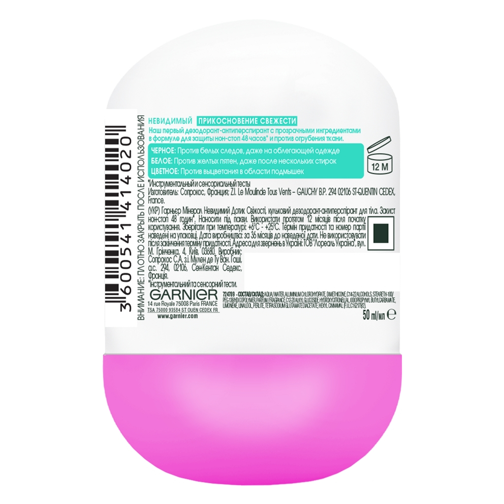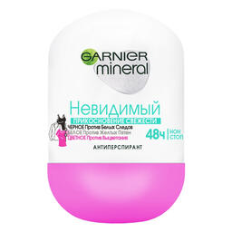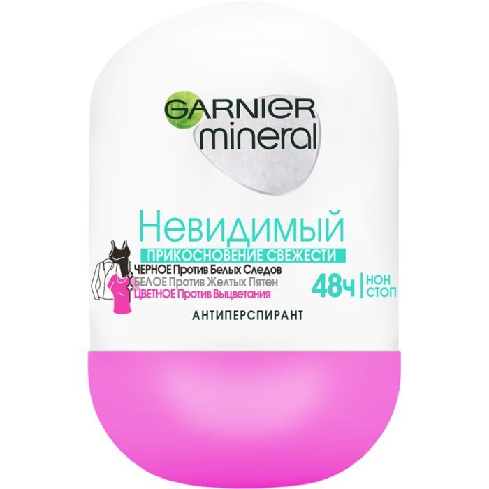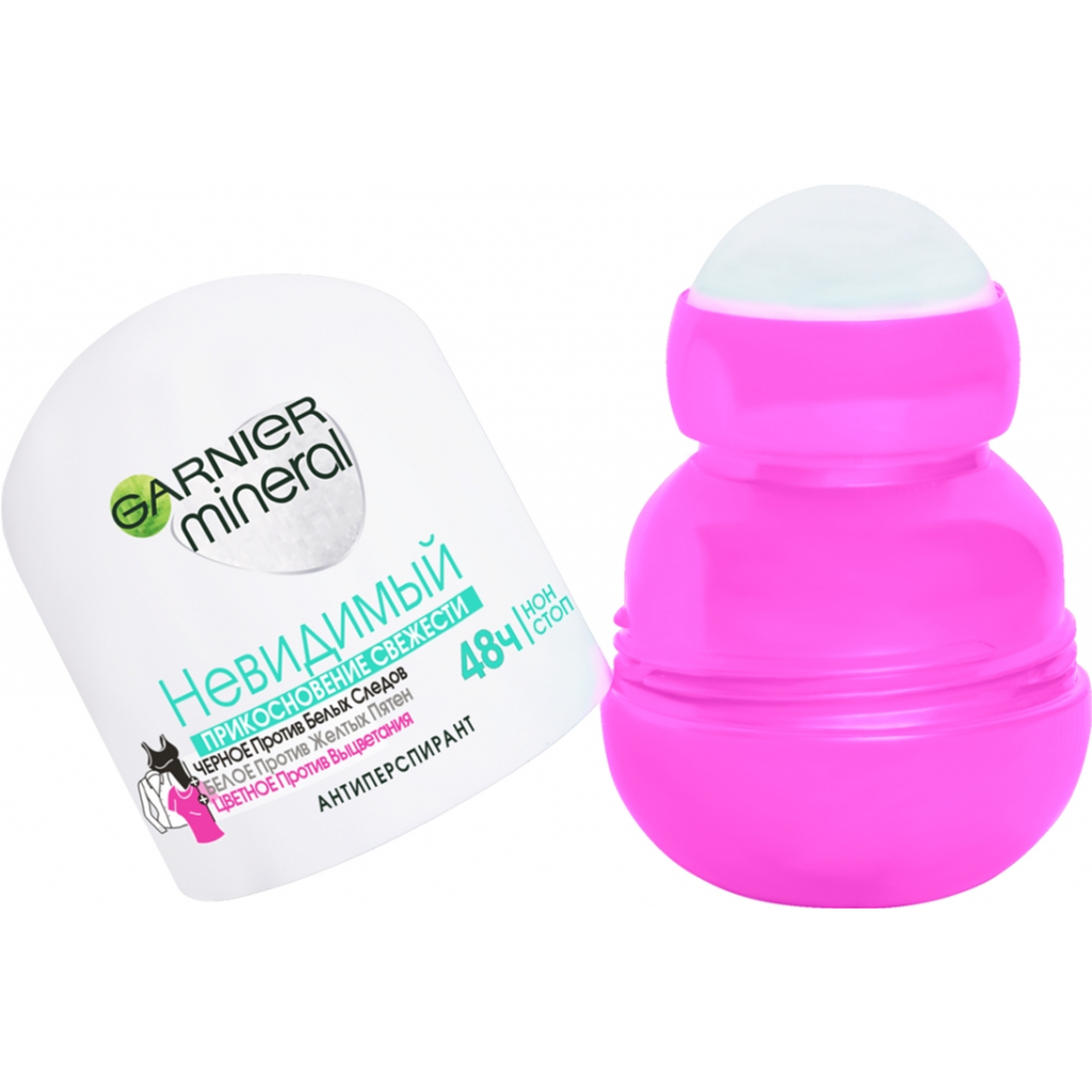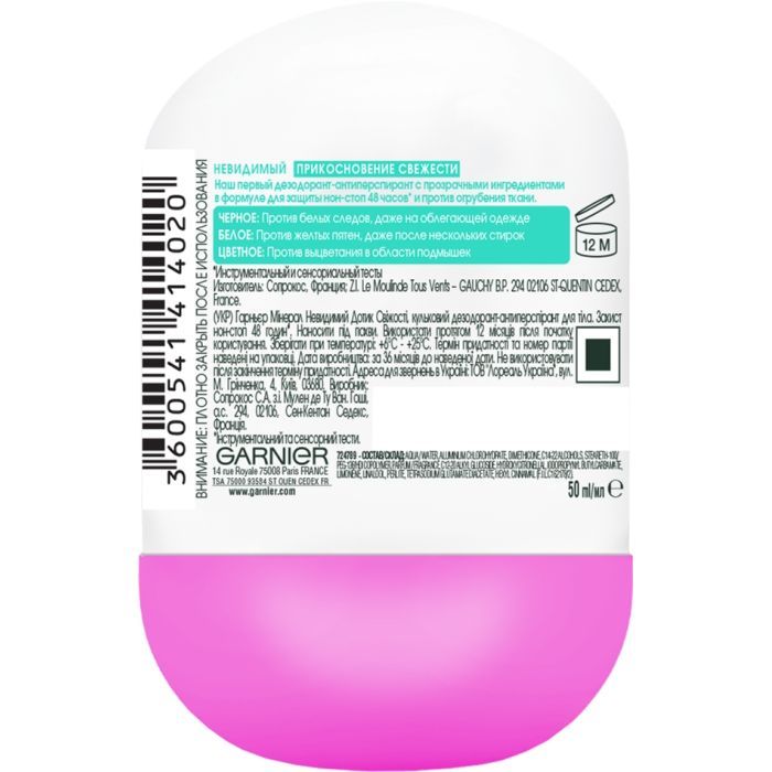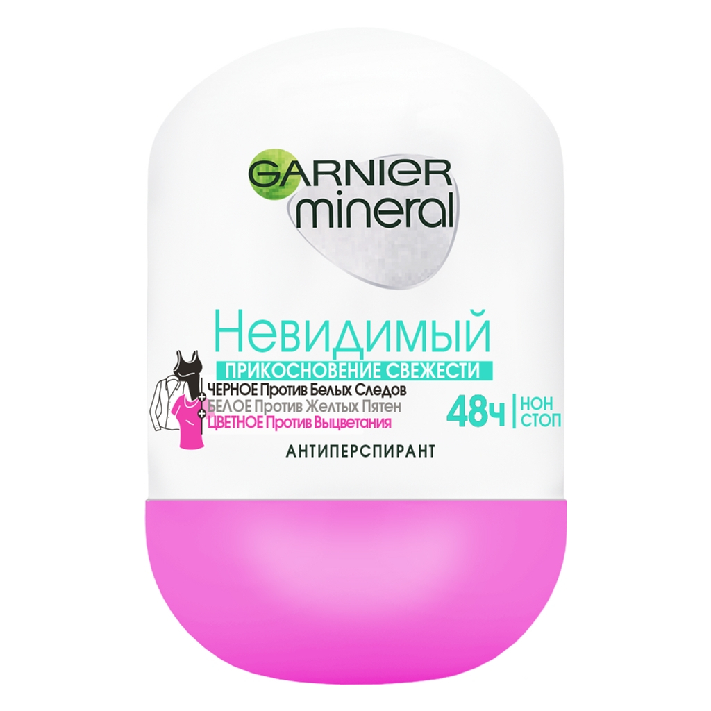Дезодорант антиперспірант Garnier Mineral Невидимий Дотик свіжості роликовий з захистом від слідів, плям, вицвітання — не тільки захистить від поту й запаху упродовж 48 годин, але й подбає про ваш одяг. Формула нового покоління з прозорими інгредієнтами захистить ваш одяг: від білих слідів на чорному, жовтих плям на білому та від вицвітання кольорового. Антиперспірант не містить спиртів і парабенів, ніжно доглядає й дає змогу шкірі дихати.
