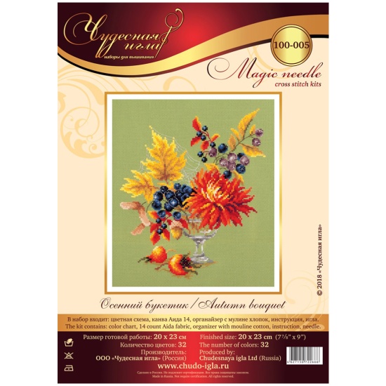 Набор для вышивания ЧУДЕСНАЯ ИГЛА 100-005 Осенний букетик 20х23смПри кажущейся простоте техника 'крест' позволяет создавать настоящие картины богатой палитрой, плавными цветовыми переходами. Чтобы получился отличный результат, нужны качественные материалы, продуманная схема и терпение мастерицы.'Чудесная игла' – бренд наборов для вышивания крестом, основанный в 2002 году в Москве. Дизайнеры компании стараются добиться реалистичной цветовой гаммы и точной проработки сюжета. Каждый артикул отшивается несколько раз, чтобы откорректировать возможные ошибки.В упаковке: канва Aida 14 зеленая, хлопковые мулине, игла гобеленовая №24, цветная символьная схема, инструкция.Количество цветов: 24.Для удобства нитки разобраны на бумажном органайзере.Размер: 20х23 см.