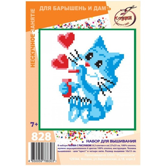 Набор для вышивания РС СТУДИЯ 828 Влюбленный котик 10х13 смСекрет отличной вышивки – в продуманной схеме, качественных материалах, терпении и аккуратности мастерицы. Следуйте инструкции, выкладывайте равномерные стежки, и постепенно из-под вашей иглы начнет 'проступать' картина с тщательно прорисованными деталями.Для вышивания используется крупная сетчатая канва Aida 11 из 100% хлопка – работать с ней просто, она идеальна для сюжетов с небольшим количеством цветов и понравится начинающим. На канву уже нанесен рисунок водорастворимыми красителями, что поможет вам быстро и без ошибок закончить вышивку.В наборе: канва Aida 11 с нанесенным рисунком-схемой, нитки мулине, игла, инструкция.Количество цветов: 6.