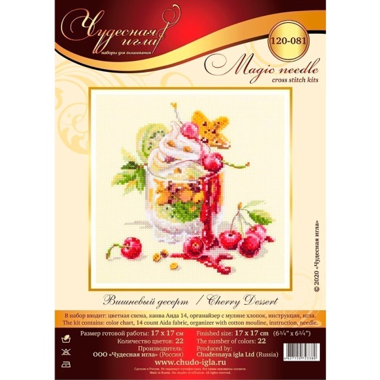 Набор для вышивания ЧУДЕСНАЯ ИГЛА 120-081 Вишнёвый десерт 17х17смПри кажущейся простоте техника 'крест' позволяет создавать настоящие картины богатой палитрой, плавными цветовыми переходами. Чтобы получился отличный результат, нужны качественные материалы, продуманная схема и терпение мастерицы.'Чудесная игла' – бренд наборов для вышивания крестом, основанный в 2002 году в Москве. Дизайнеры компании стараются добиться реалистичной цветовой гаммы и точной проработки сюжета. Каждый артикул отшивается несколько раз, чтобы откорректировать возможные ошибки.В наборе: канва Aida 14 бежевого цвета, хлопковые нитки мулине (хлопок) (22 цвета), игла гобеленовая №24, цветная символьная схема, инструкция.