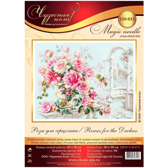 Набор для вышивания ЧУДЕСНАЯ ИГЛА 110-011 Розы для герцогини 40х30смПри кажущейся простоте техника 'крест' позволяет создавать настоящие картины богатой палитрой, плавными цветовыми переходами. Чтобы получился отличный результат, нужны качественные материалы, продуманная схема и терпение мастерицы.'Чудесная игла' – бренд наборов для вышивания крестом, основанный в 2002 году в Москве. Дизайнеры компании стараются добиться реалистичной цветовой гаммы и точной проработки сюжета. Каждый артикул отшивается несколько раз, чтобы откорректировать возможные ошибки.В наборе: канва Aida-14, мулине хлопок, игла гобеленовая № 24, цветная символьная схема, инструкция.Количество цветов: 34.