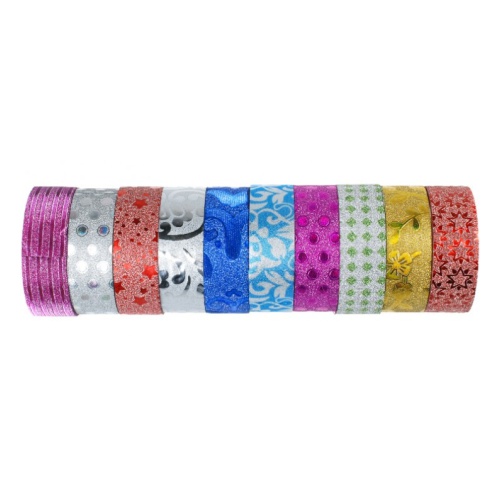 Декоративная клейкая лента выполнен из пропитанной цветной бумаги с блеском, особенность липкого слоя - его можно снять, не повреждая основу композиции.