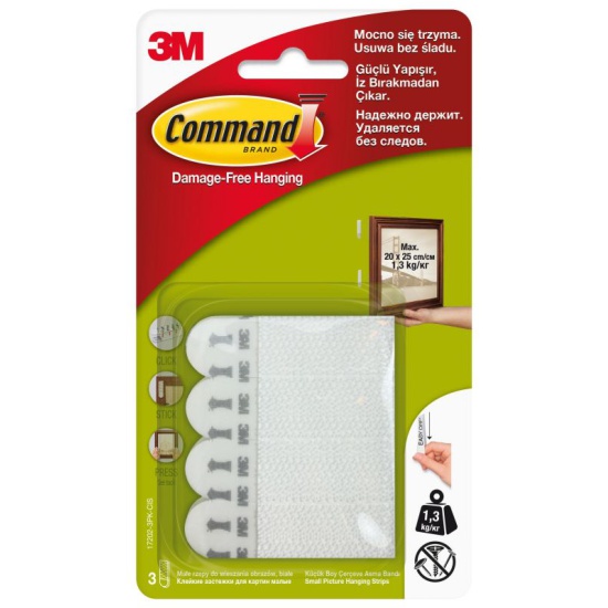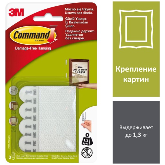 Command™ - это уникальная адгезивная технология для легкого, надежного и безопасного крепления разнообразных аксессуаров на вертикальной поверхности. Данная система позволяет организовать пространство без применения инструментов и не повреждая поверхности. При необходимости можно удалить, потянув за клейкую полоску. Благодаря настенным застежкам Command® любое помещение легко декорируется картинами и плакатами. Все изображения, зафиксированные настенными застежками, легко заменяются, т.к. при снятии картины нет необходимости удалять с поверхности сам крепеж. Одна застежка фиксируется на стене, а другая - на раме. Именно поэтому Вы можете вешать и снимать Ваши фотографии и другие малые декоративные предметы так часто, как пожелаете.Свойства:Максимальная нагрузка: 1,3 кг на упаковкуДля рамок и картинЛегко крепитсяДержит крепкоУдаляется без следаБез применения инструментовДля надежности сцепления с поверхностью, перед монтажом рекомендуем обработать поверхность специальной салфеткой пропитанной праймером 94EF артикул 06396.Эта салфетка в разы увеличивает силу и скорость набора адгезии на всех, в том числе низкоэнергетических поверхностях.
