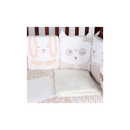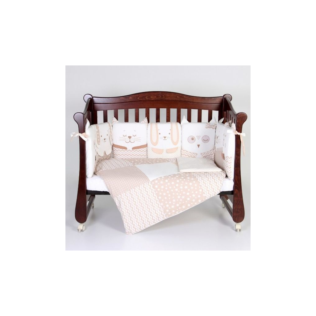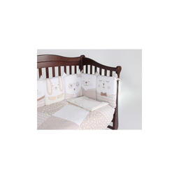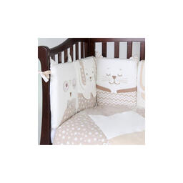 Smiling animals beige new - постільний комплект з колекції Cuties, для якої є характерними вишиті або надруковані милі мордочки тваринок. Особливістю цього комплекту є 4 подушечки захисту з вишивкою та аплікацією мордочок тварин та птахів, які створять казкову атмосферу для Вашого малюка.