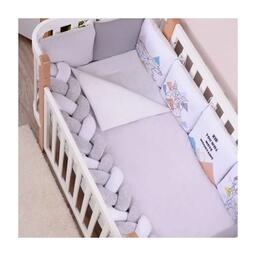 Наповнювач: ковдра - силіконізоване волокно, подушка та подушки захисту - синтепон, бампер-коса - холлофайбер.