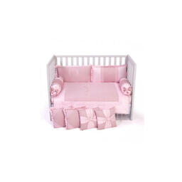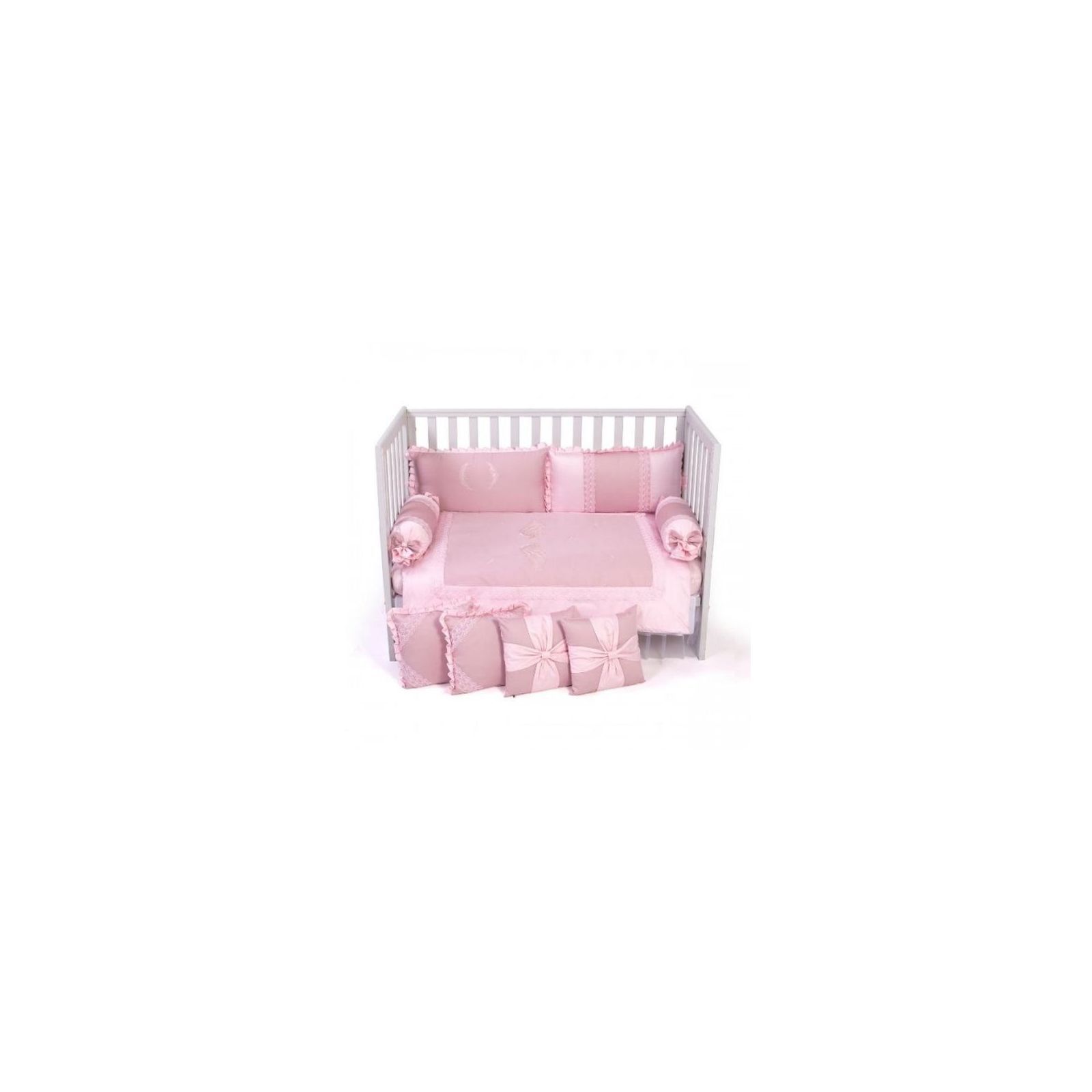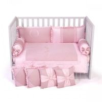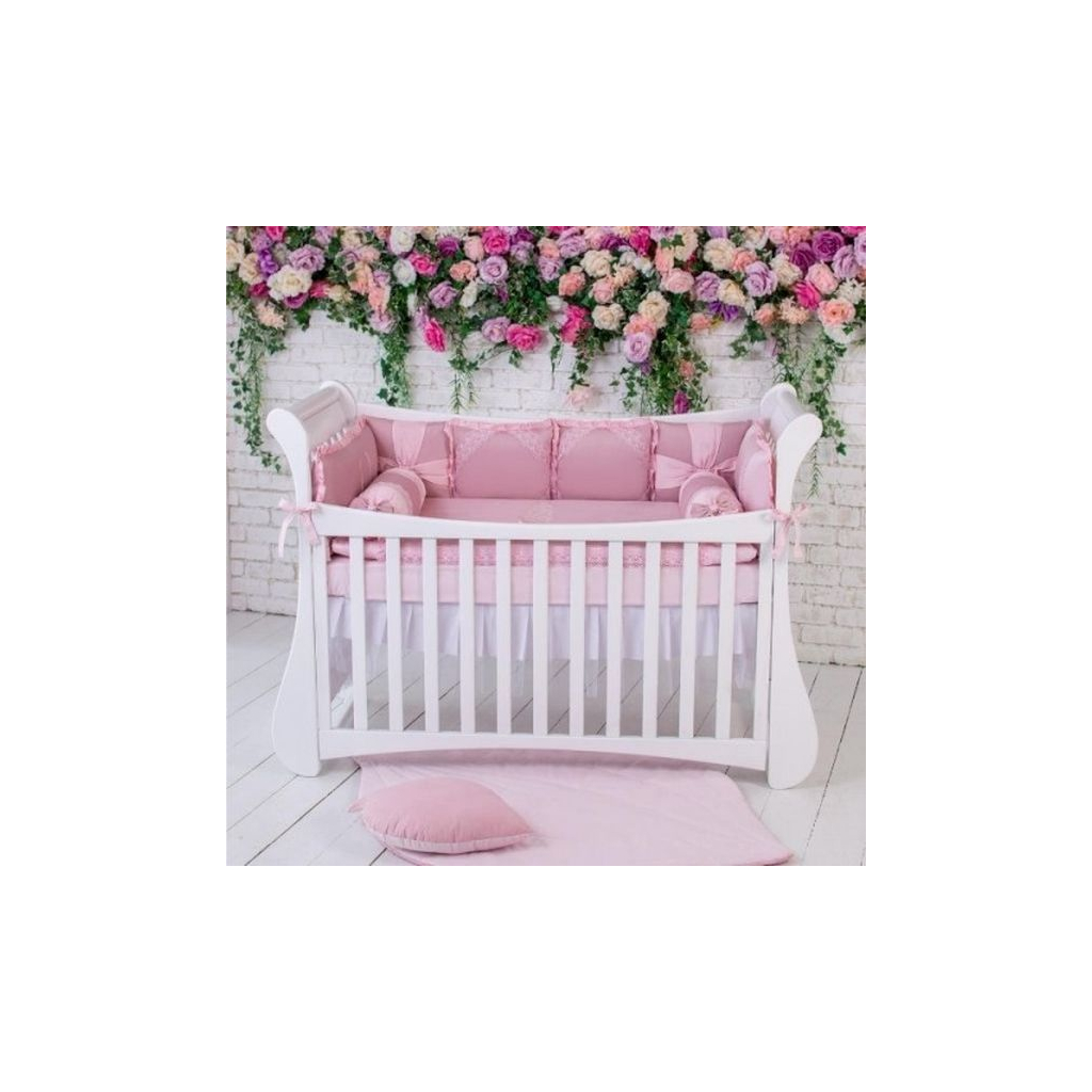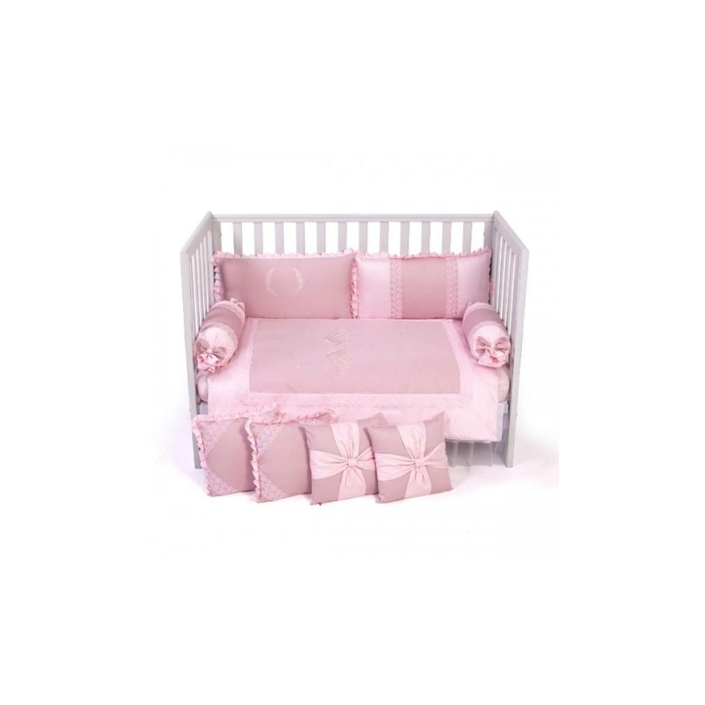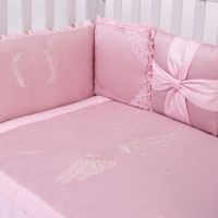Чудовий мереживний комплект в класичному стилі. Елегантні мережива по периметру всього комплекту постільної роблять його неймовірно ніжним. В комплекті 2 подушки-цукерки, які використовують як позиціонер в ліжечко, так і як просто подушечки. Примітною є вишивка ангельських крилець на підковдрі.