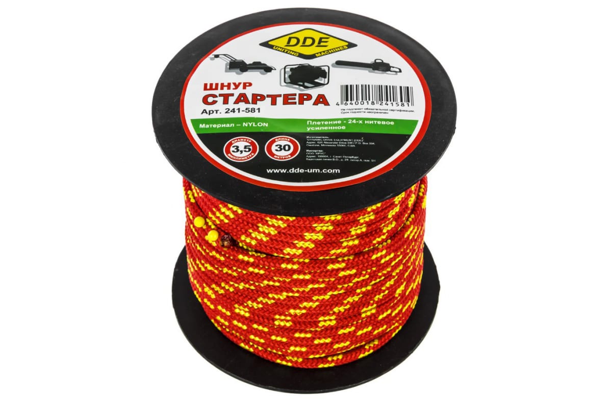 Шнур стартера DDE 241-581 применяется в бензопилах и газонокосилках. Предназначен для пуска двигателя. Изготовлен из нейлона. Поставляется на катушке. Длина - 30 м. Диаметр - 3.5 мм.