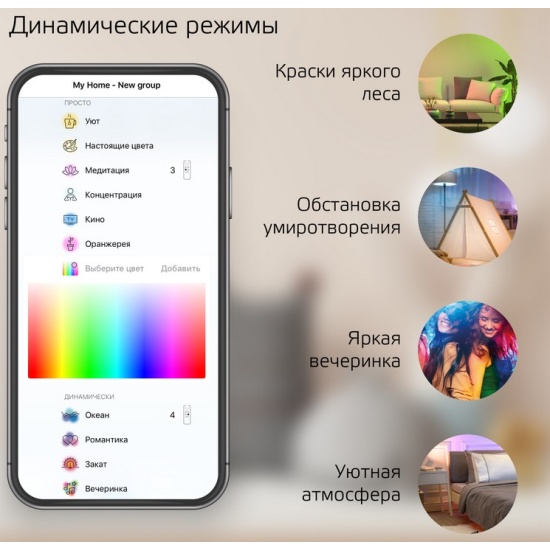 Дистанционное управление: управляйте светом через мобильное приложение или голосовой помощник (Алиса, Siri, Google, Маруся)Миллионы оттенков: вы можете выбрать любой оттенок цветовой палитры, который подойдет под ваше настроениеУстановка расписаний: автоматизируйте пространство. Свет будет включаться и выключаться по вашему расписанию.Режимы: динамические режимы созданы в Париже специалистами по световым решениям.Сцены: понравился режим? Зафиксируйте его в сцене и включайте одним кликом на смартфоне